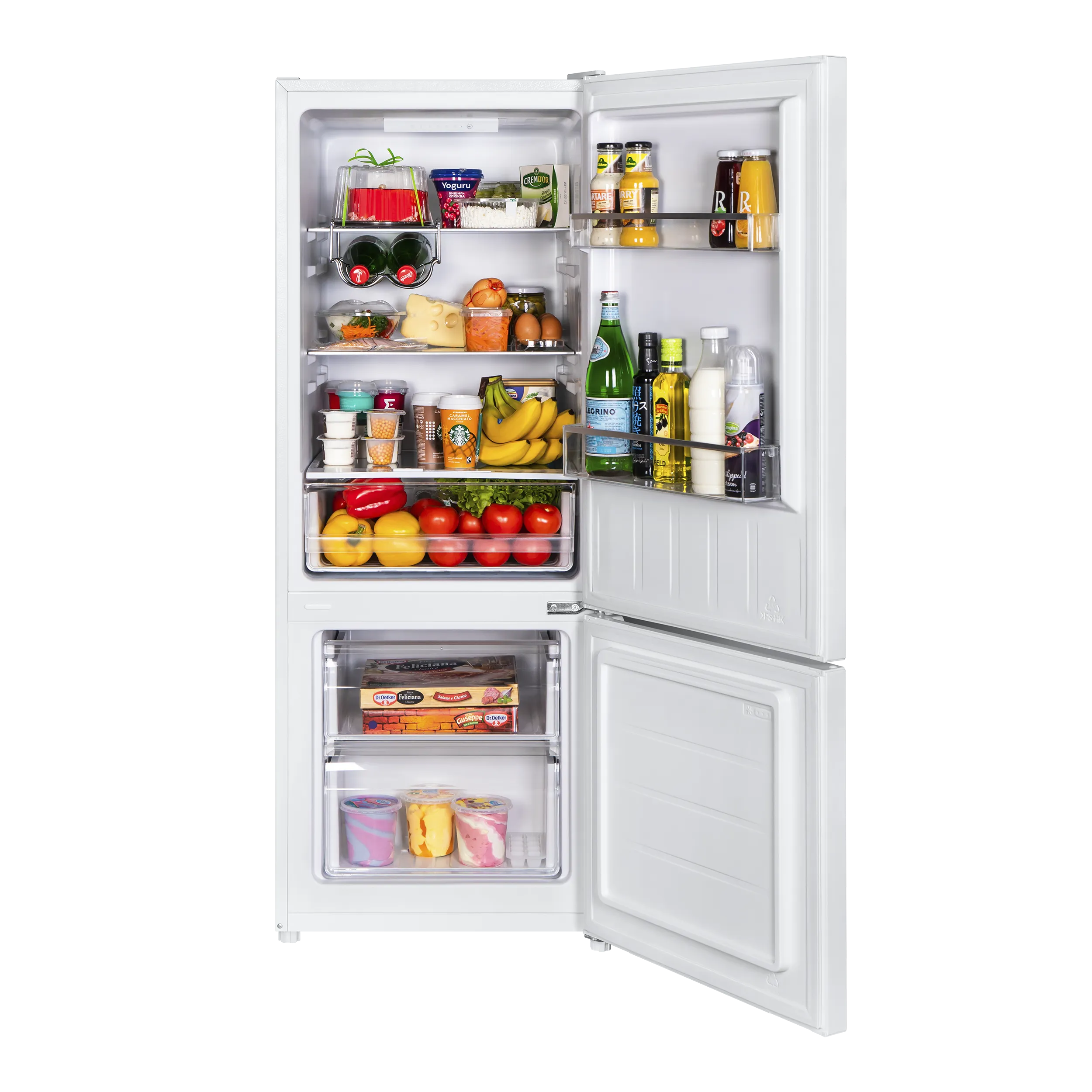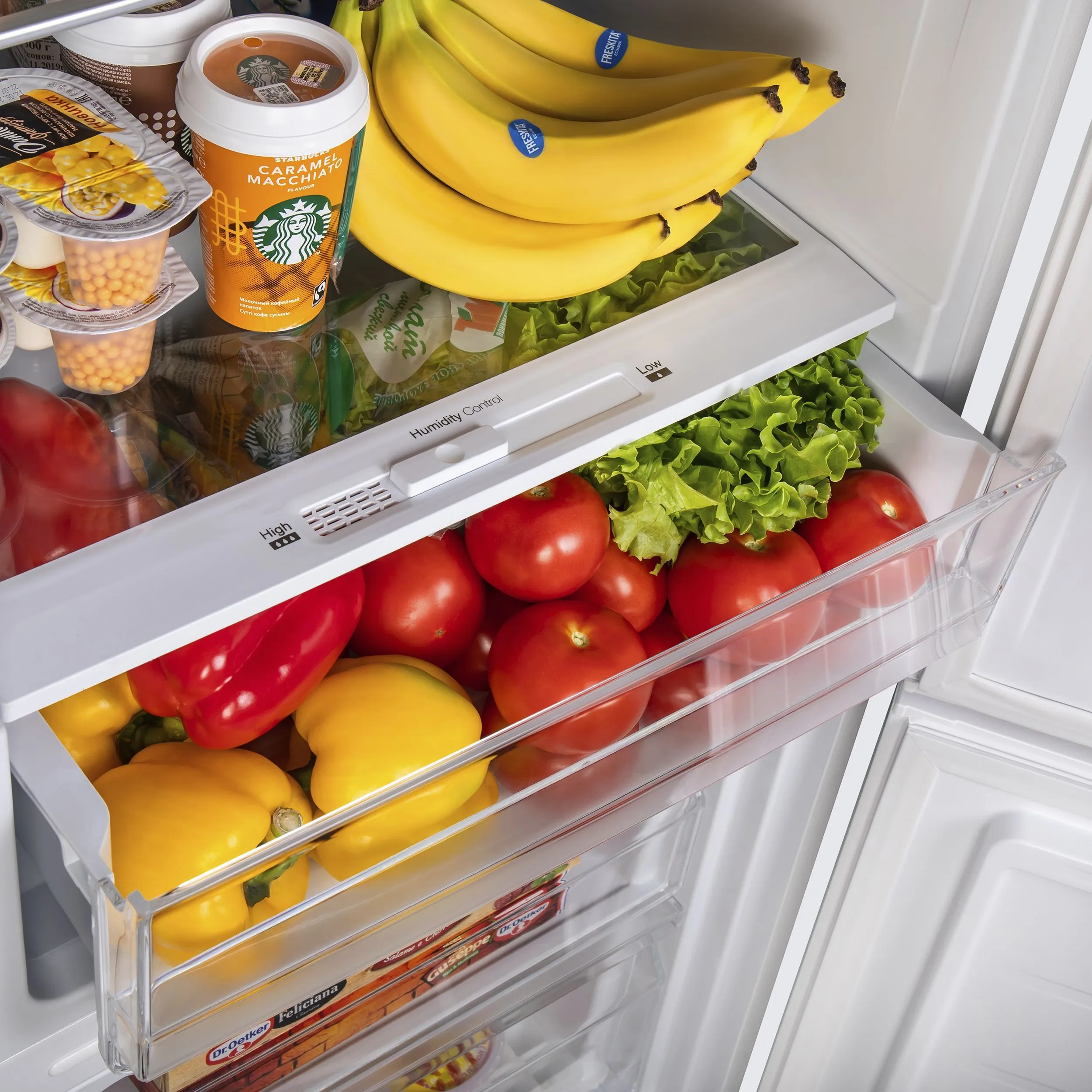 Современный двухкамерный холодильник высотой 144 см с электронным управлением, LED-подсветкой, двумя вместительными ящиками в морозильной камере, винной полкой и ящиком для овощей и фруктов с регулировкой влажности в холодильной камере.
