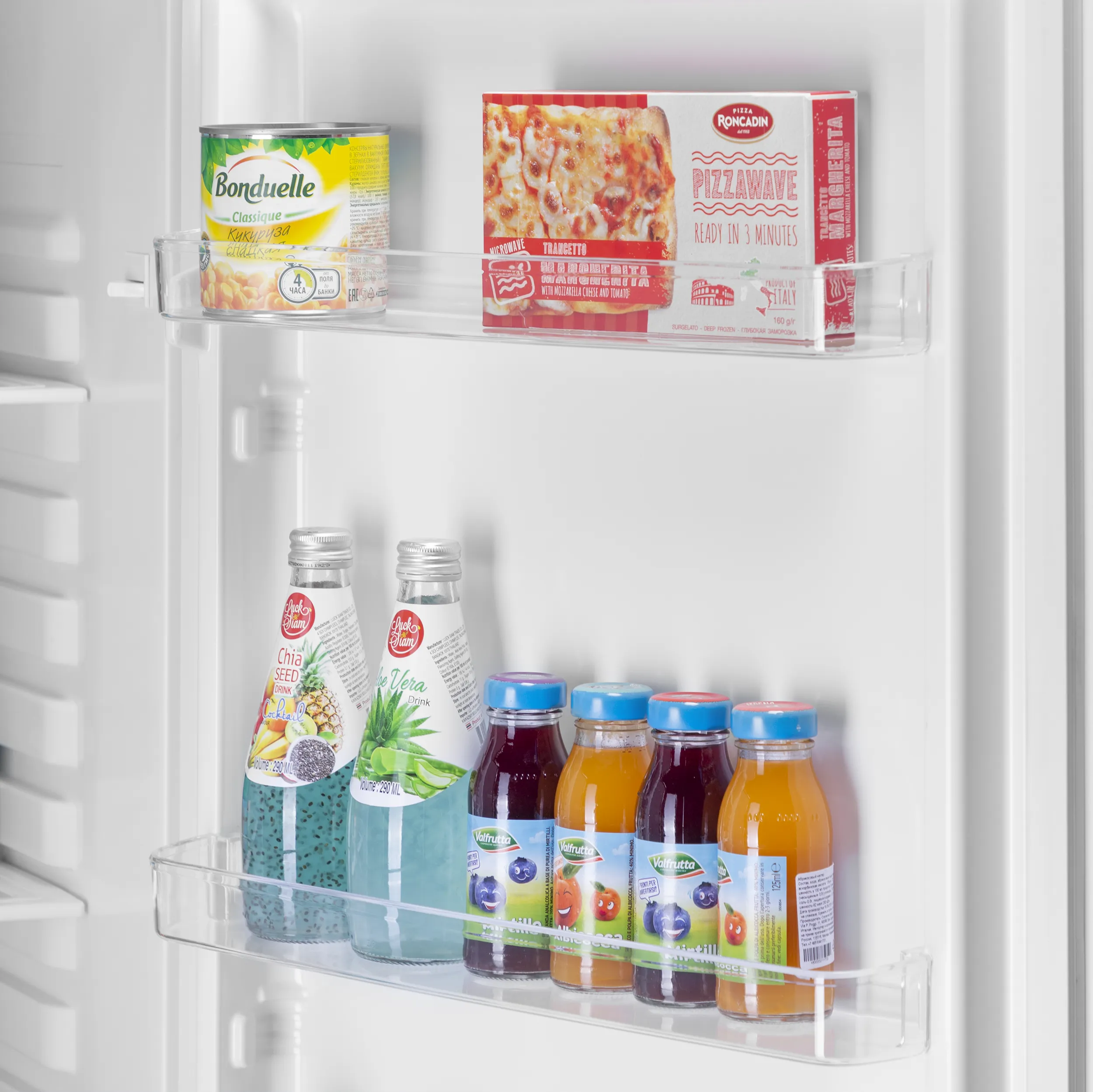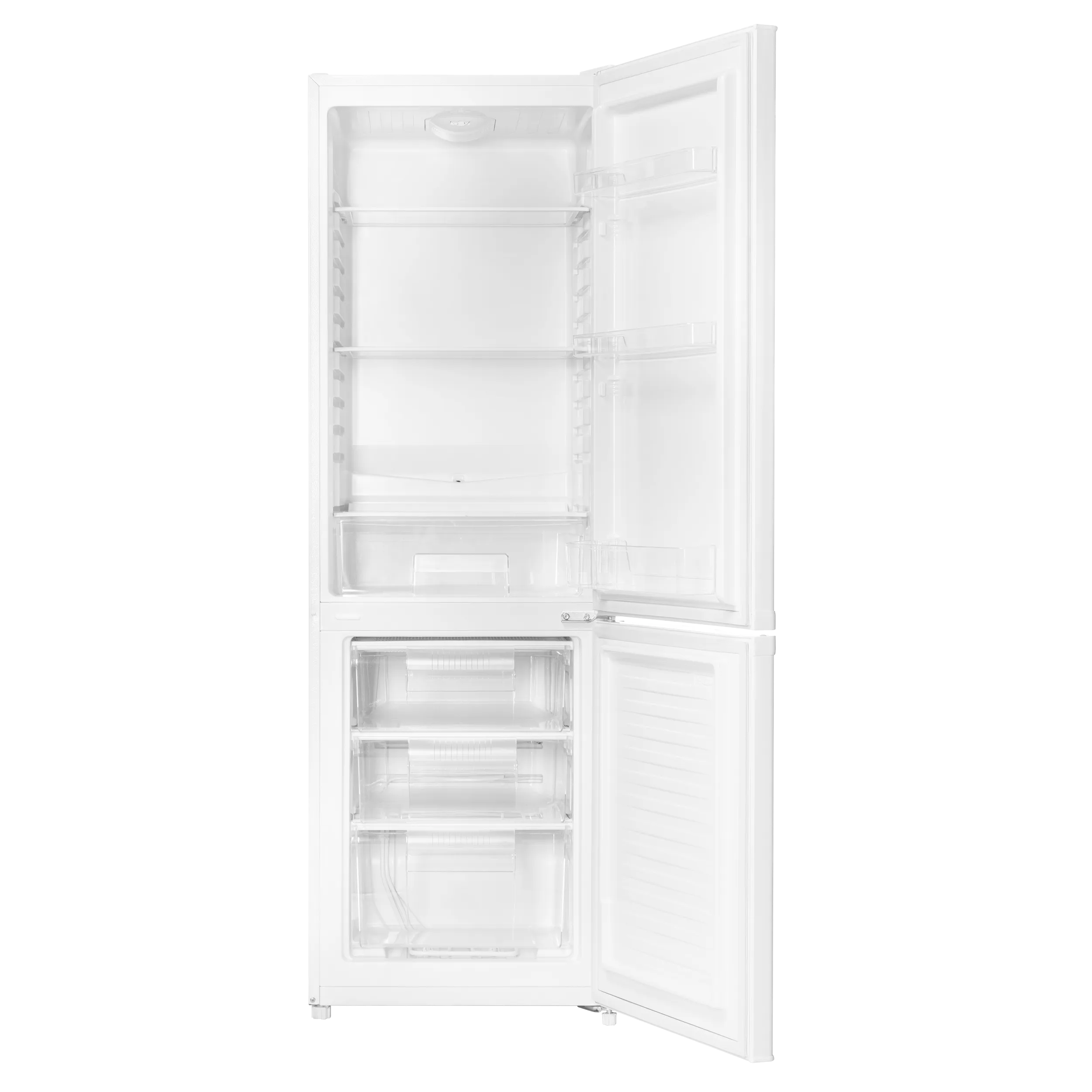Двухкамерный холодильник с тремя вместительными ящиками в морозильной камере и ящиком для овощей и фруктов. Полки из закаленного стекла переставляются по высоте, а дверцы перенавешиваются для удобства доступа с любой стороны.