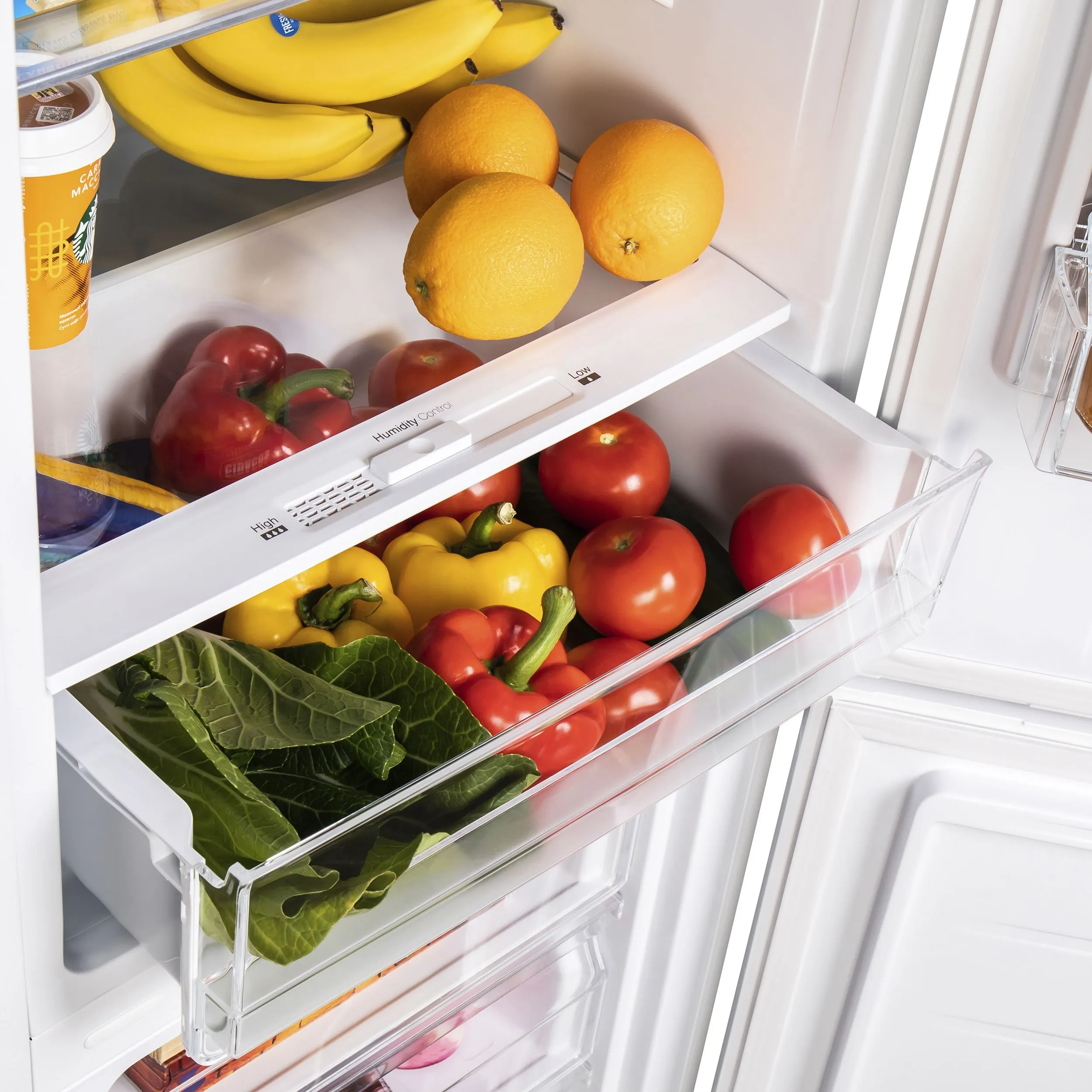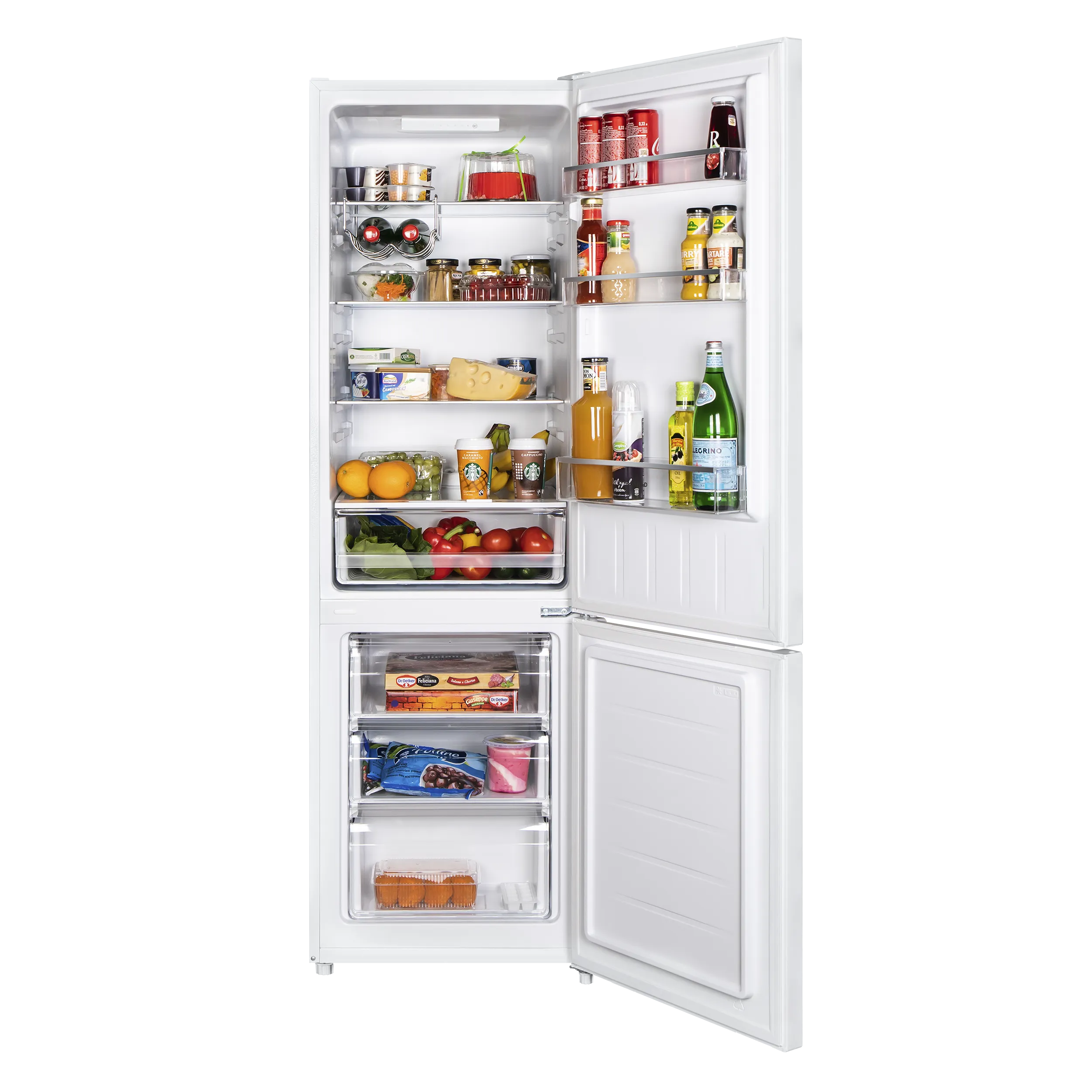 Современный двухкамерный холодильник с электронным управлением, LED-подсветкой, тремя вместительными ящиками в морозильной камере, винной полкой и ящиком для овощей и фруктов с регулировкой влажности в холодильной камере.