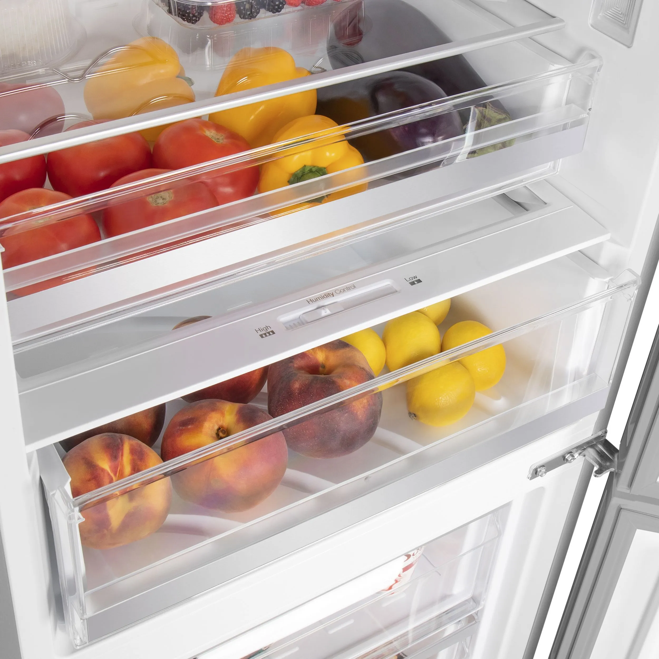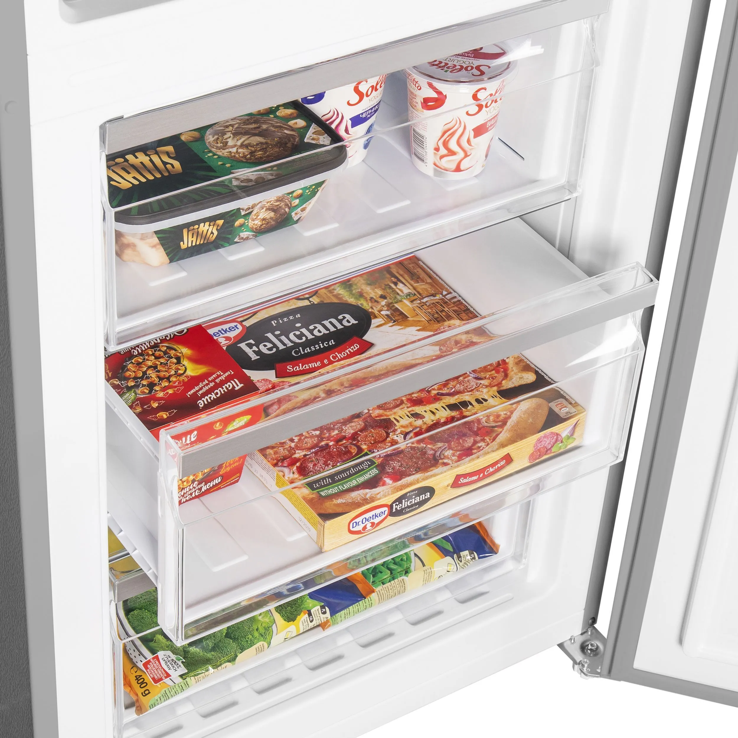 Полки из закаленного стекла, ящики в холодильной и морозильной камере, полки на двери.