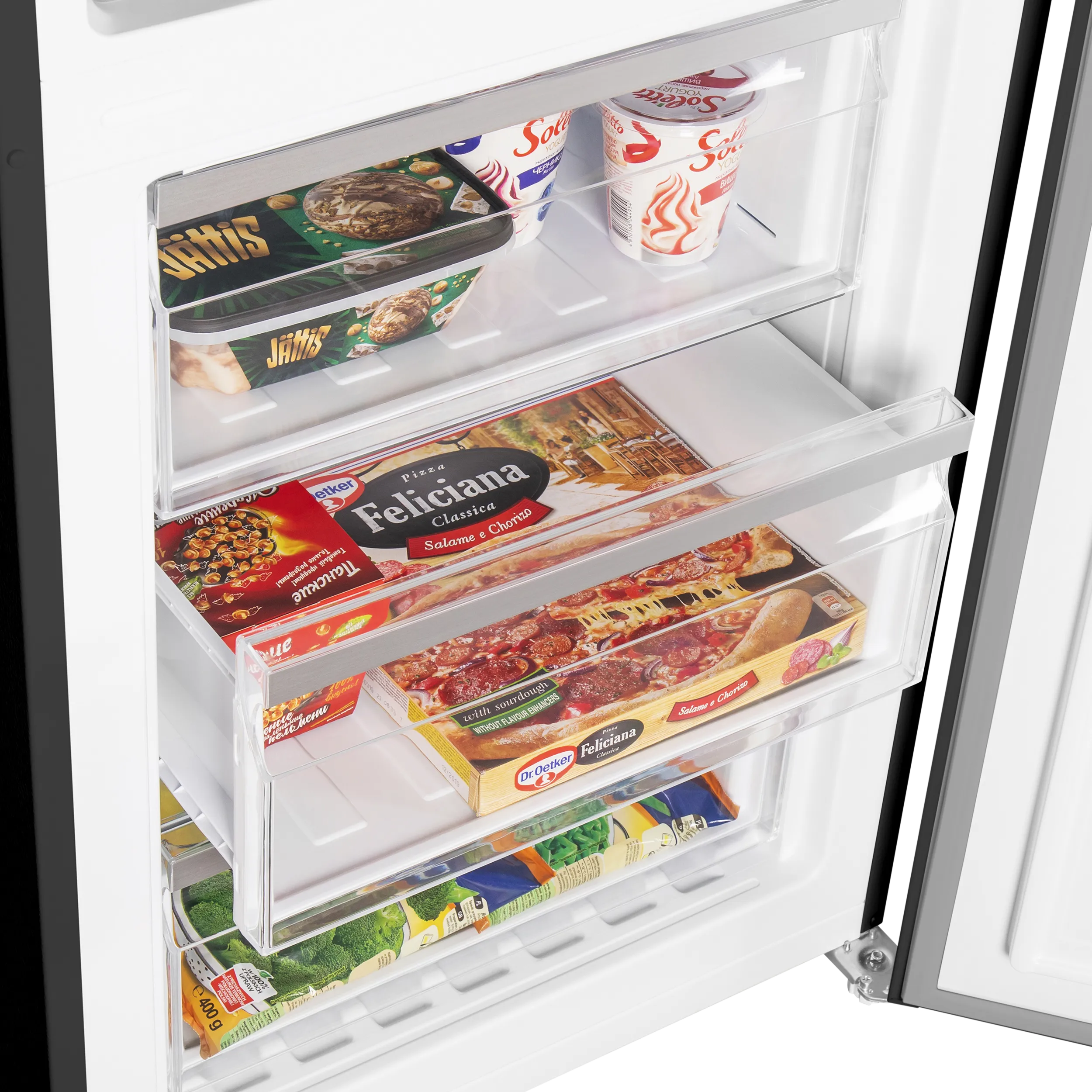 Современный  двухкамерный холодильник TOTAL NO FROST шириной 60 см с многопоточным охлаждением и сенсорной панелью управления.  Фасад выполнен из металла.