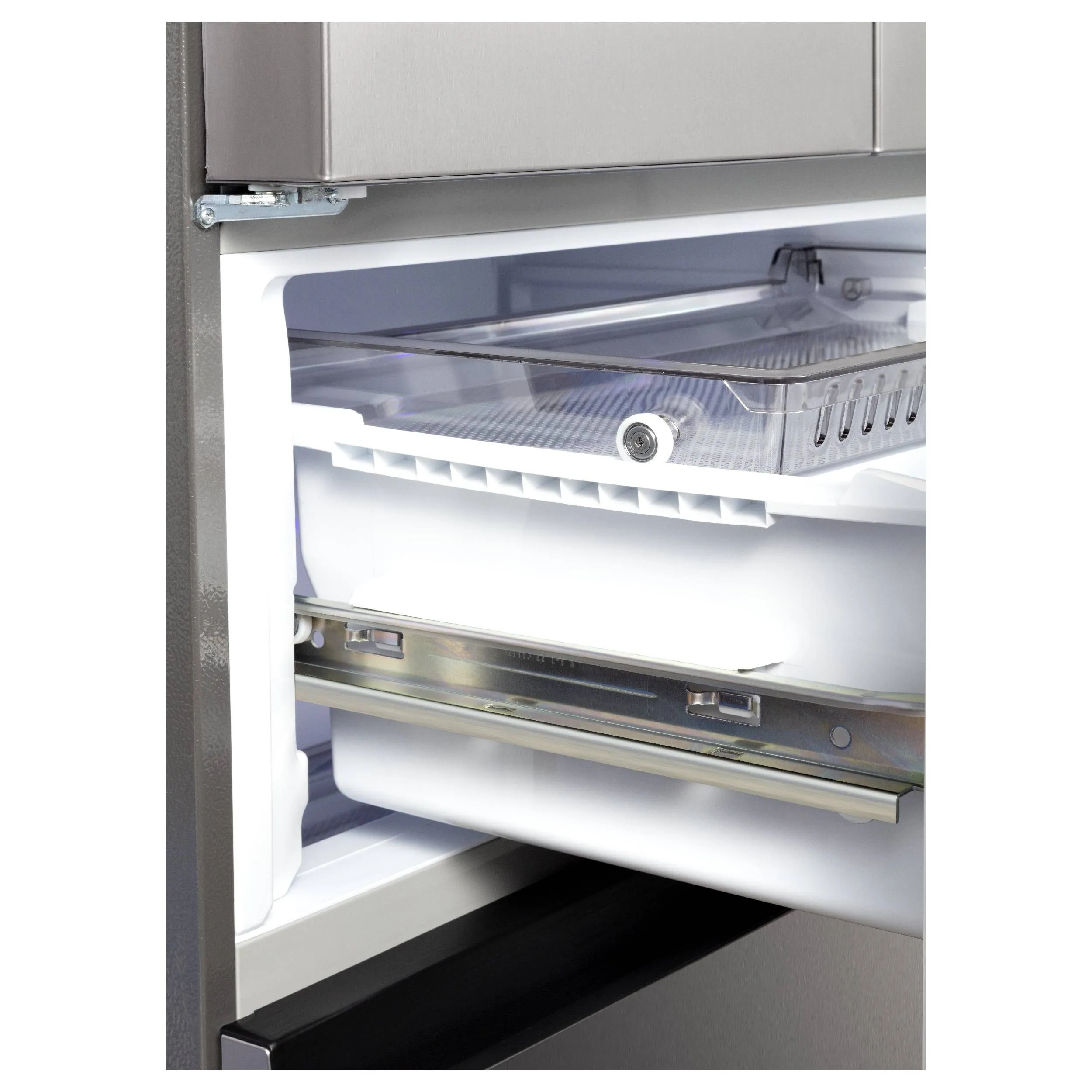 Стеклянные полки, 2 ящика для овощей в холодильном отделении с регулировкой уровня влажности, Устройство для приготовления льда ICE MATIC, LED освещение, Функция суперзаморозки