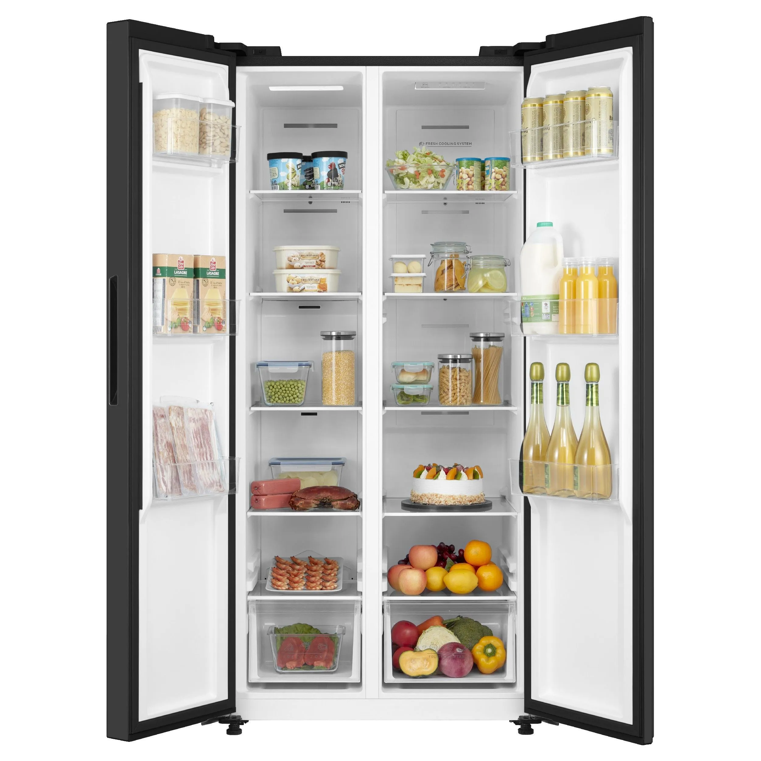 Холодильник Side-By-Side, А+,  внутреннее электронное управление, Full NO FROST, Инверторный компрессор,  Dynamic Air Cooling, режимы «Супер заморозка» и «Супер охлаждение», LED освещение камеры,  ящик для овощей, полки из закаленного стекла, объем холодильного отделения: 266 л, объем морозильного отделения: 176 л, габариты (ВхШхГ):  1775х835х635  мм,  цвет - черный