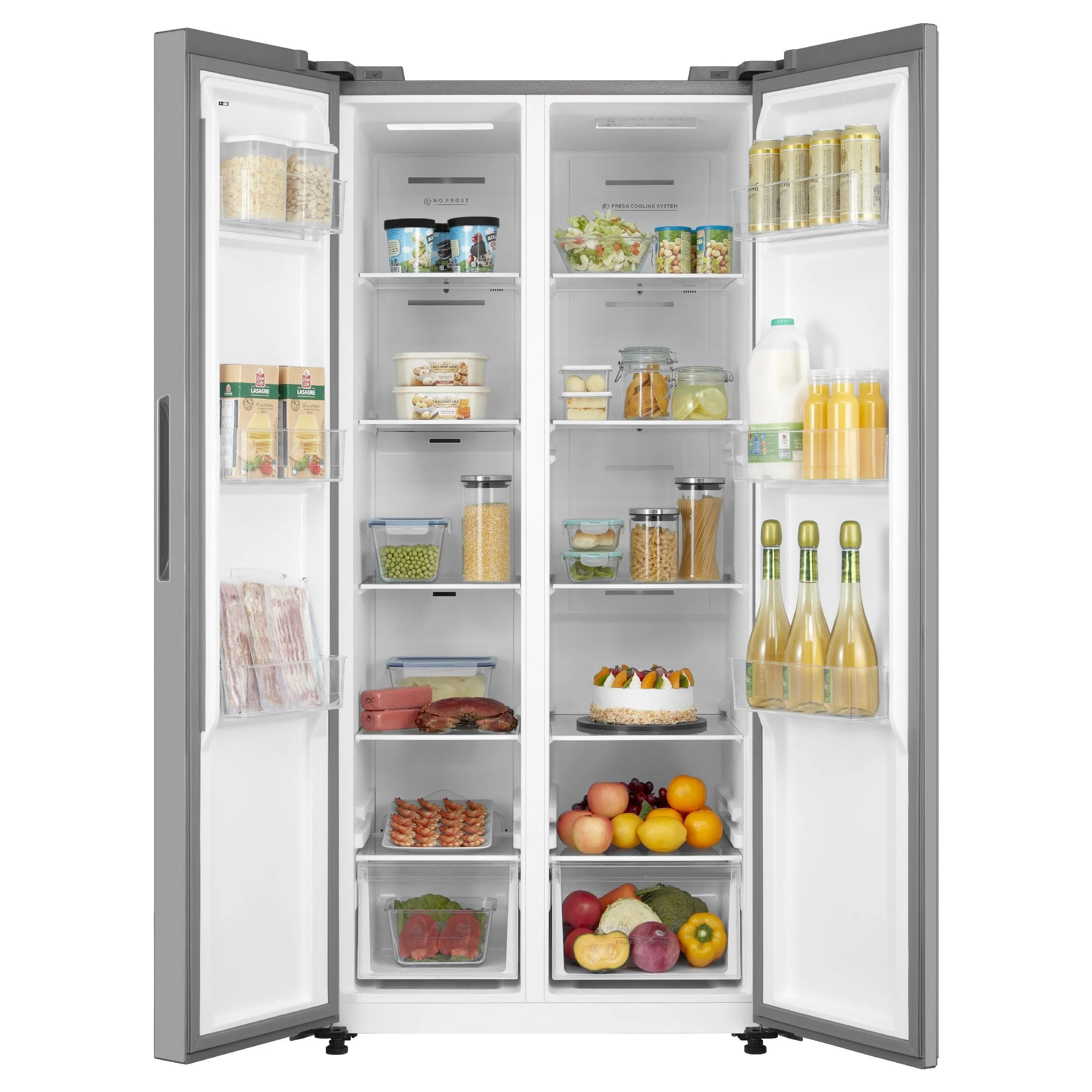 Холодильник Side-By-Side, А+,  внутреннее электронное управление, Full NO FROST, Инверторный компрессор,  Dynamic Air Cooling, режимы «Супер заморозка» и «Супер охлаждение», LED освещение камеры,  ящик для овощей, полки из закаленного стекла, объем холодильного отделения: 266 л, объем морозильного отделения: 176 л, габариты (ВхШхГ):  1775х835х635  мм,  цвет - нержавеющая сталь