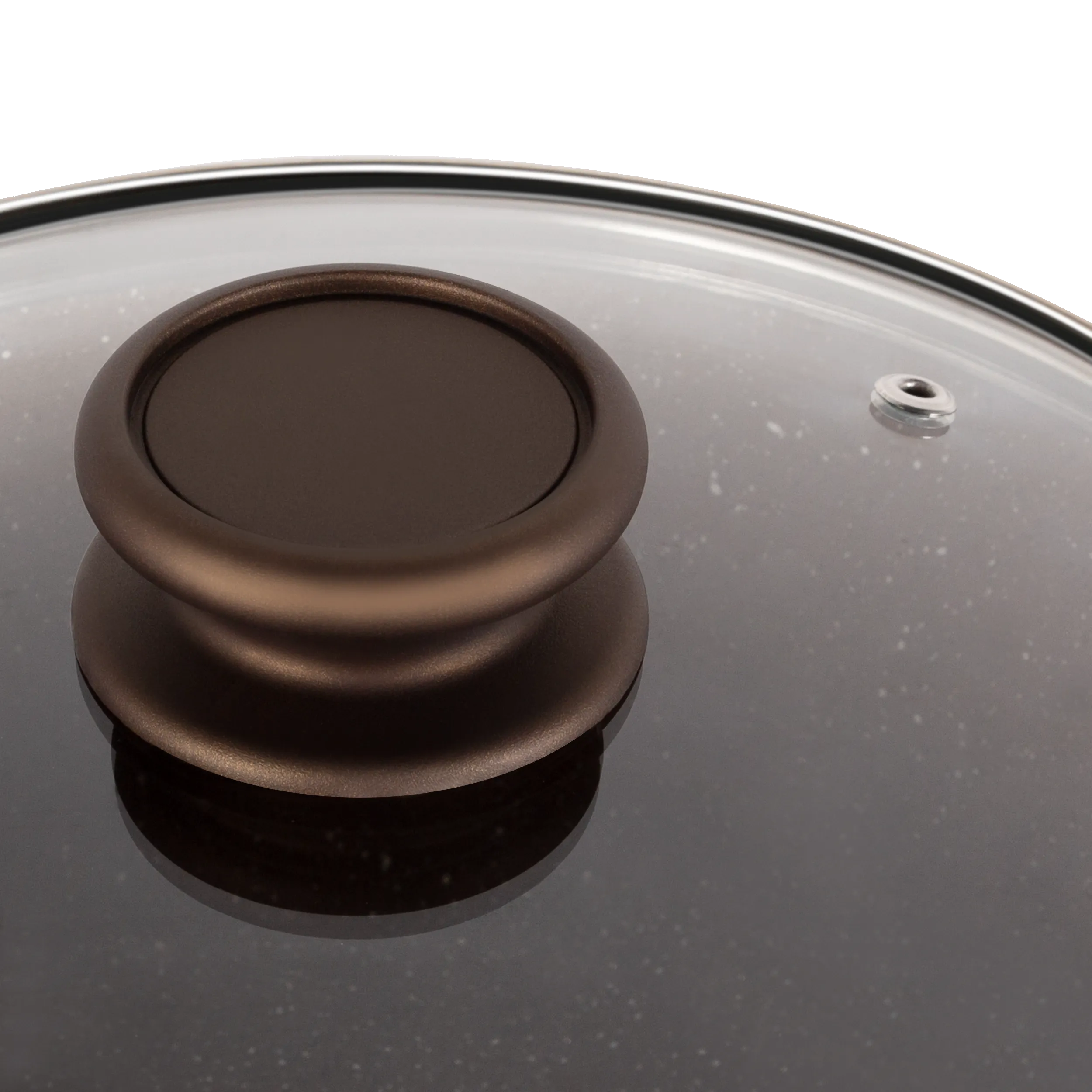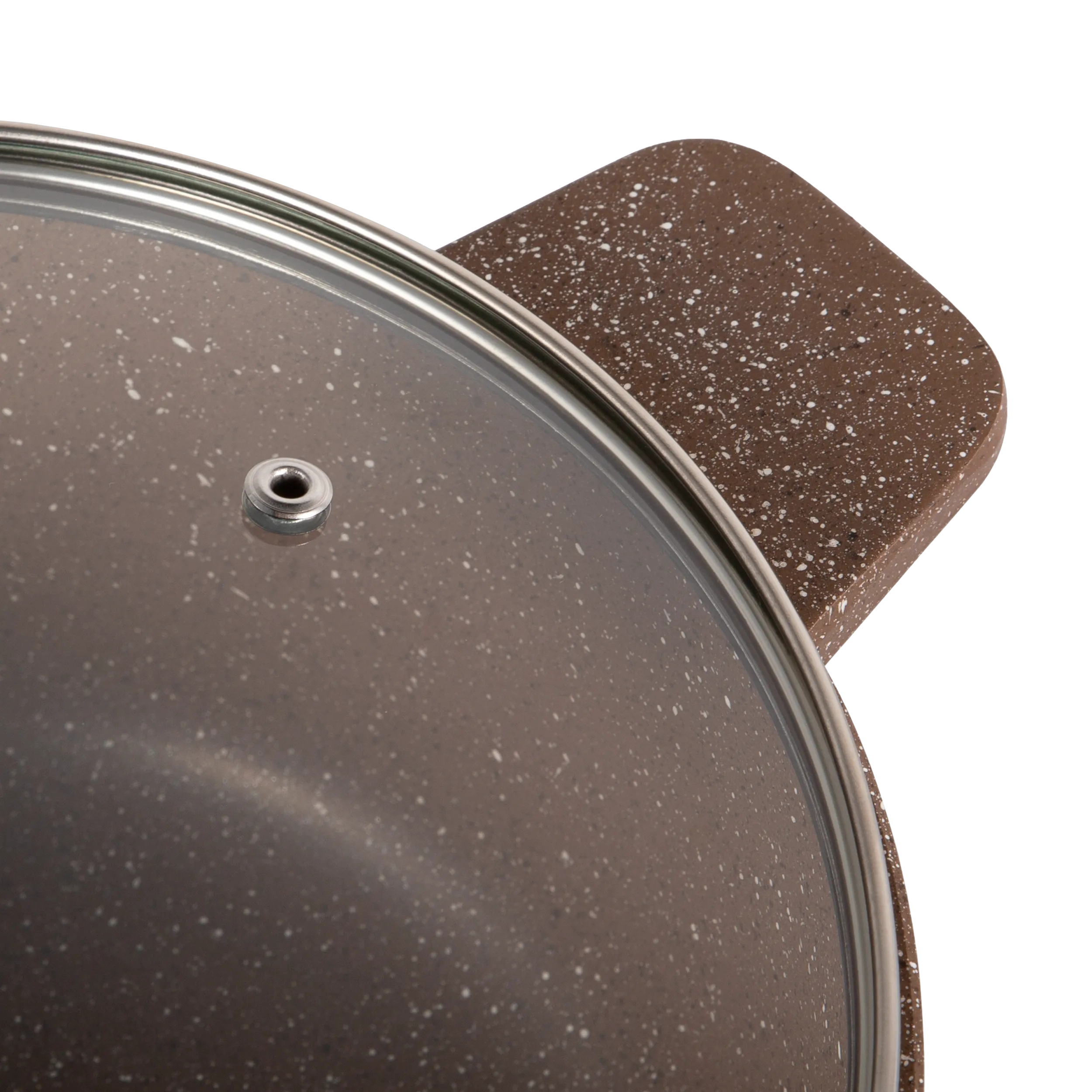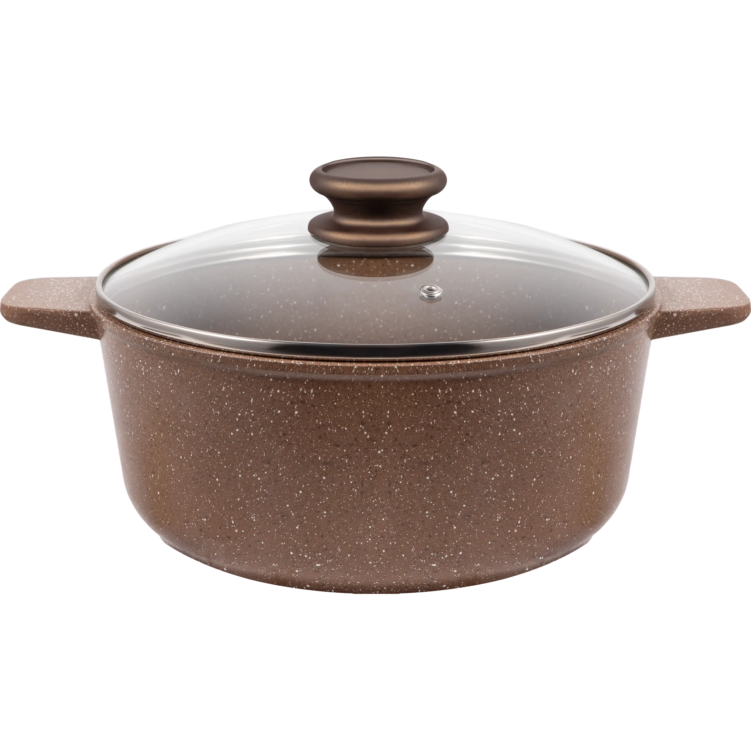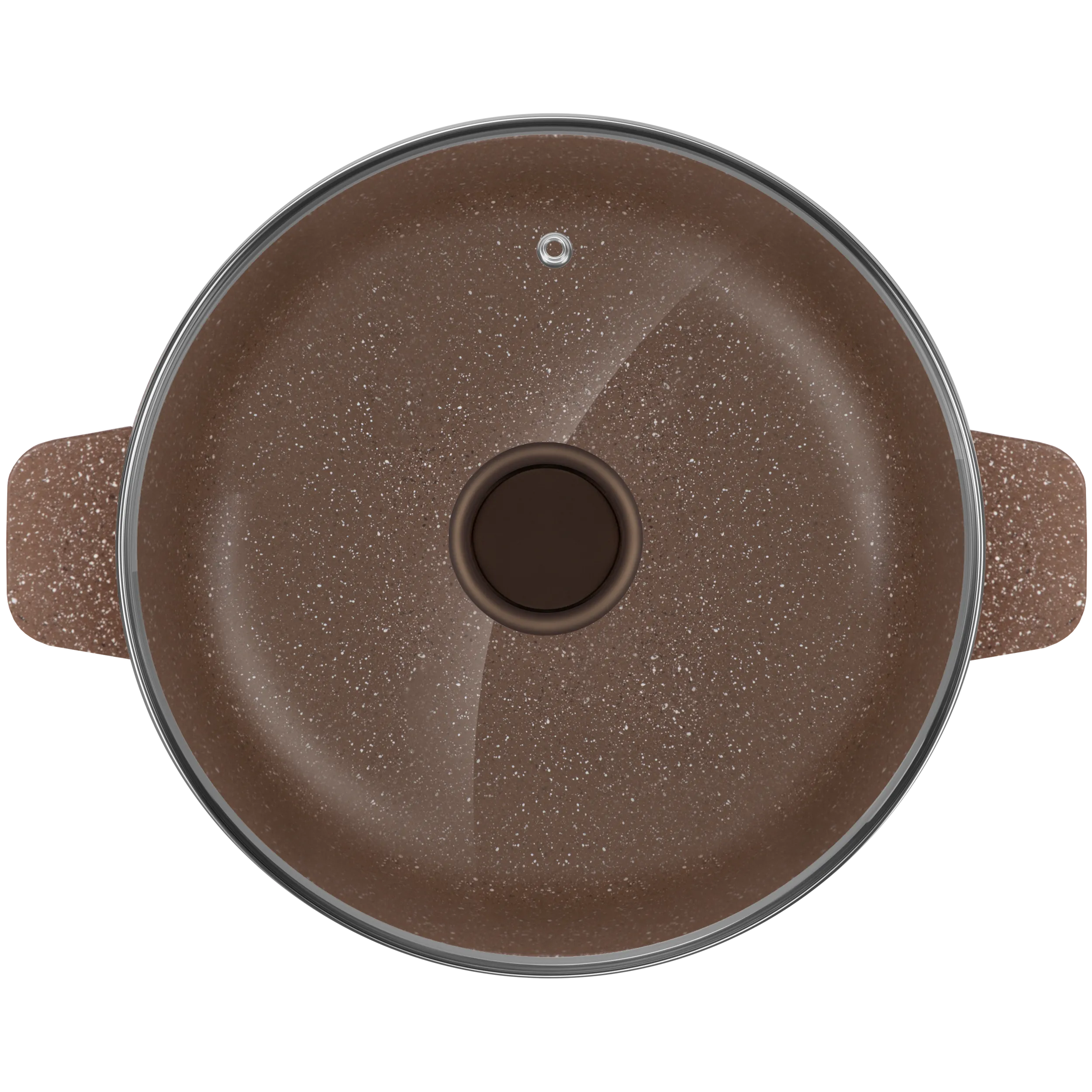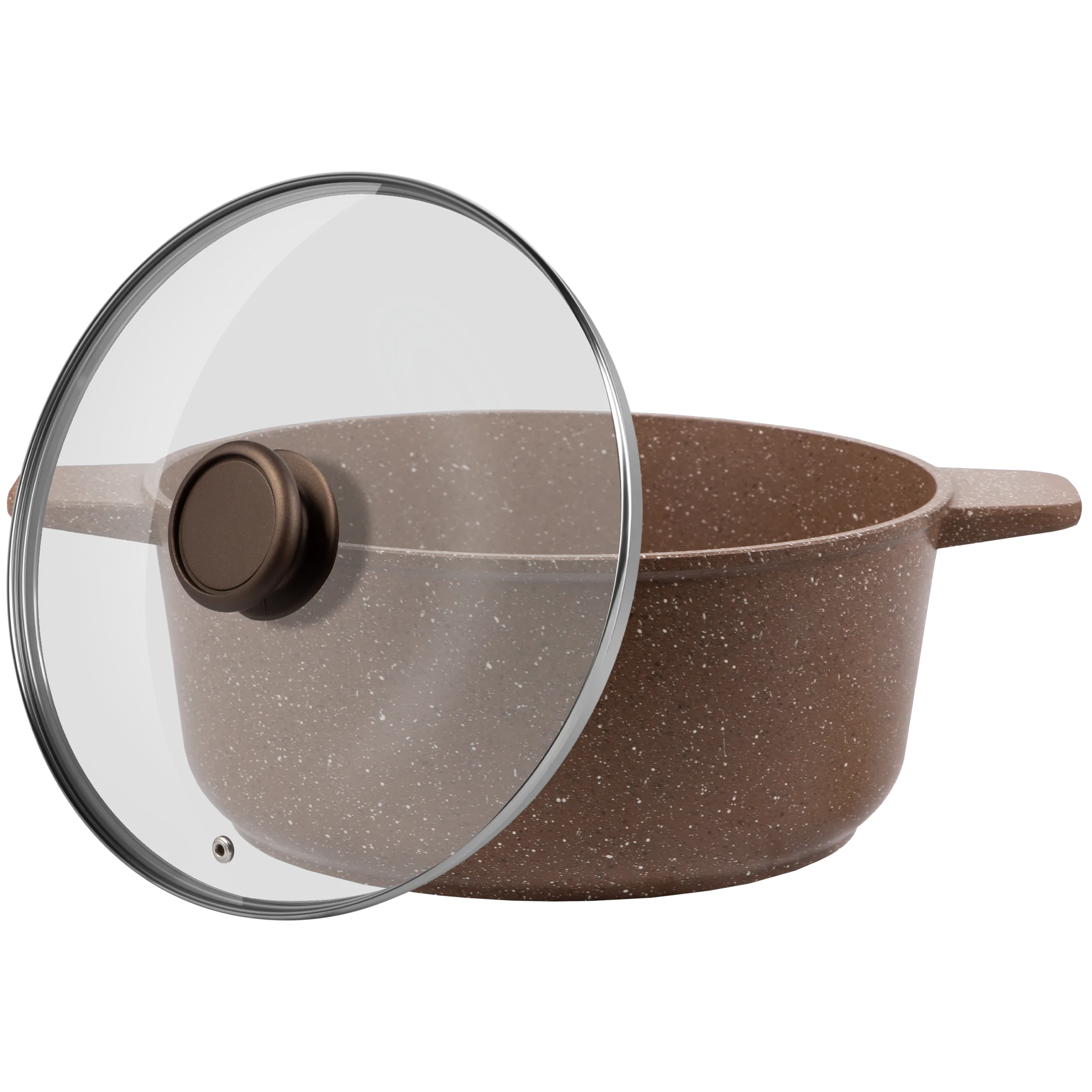 Элегантная кастрюля с эффектным мраморным покрытием и стеклянной крышкой. Держатель крышки выполнен  из термостойкого бакелита с эффектом soft-touch в универсальном цвете, подойдет под любой интерьер кухни. Современные и стильные формы- мы учли все мировые тенденции, чтобы посуда была 100% экологичной и стильной