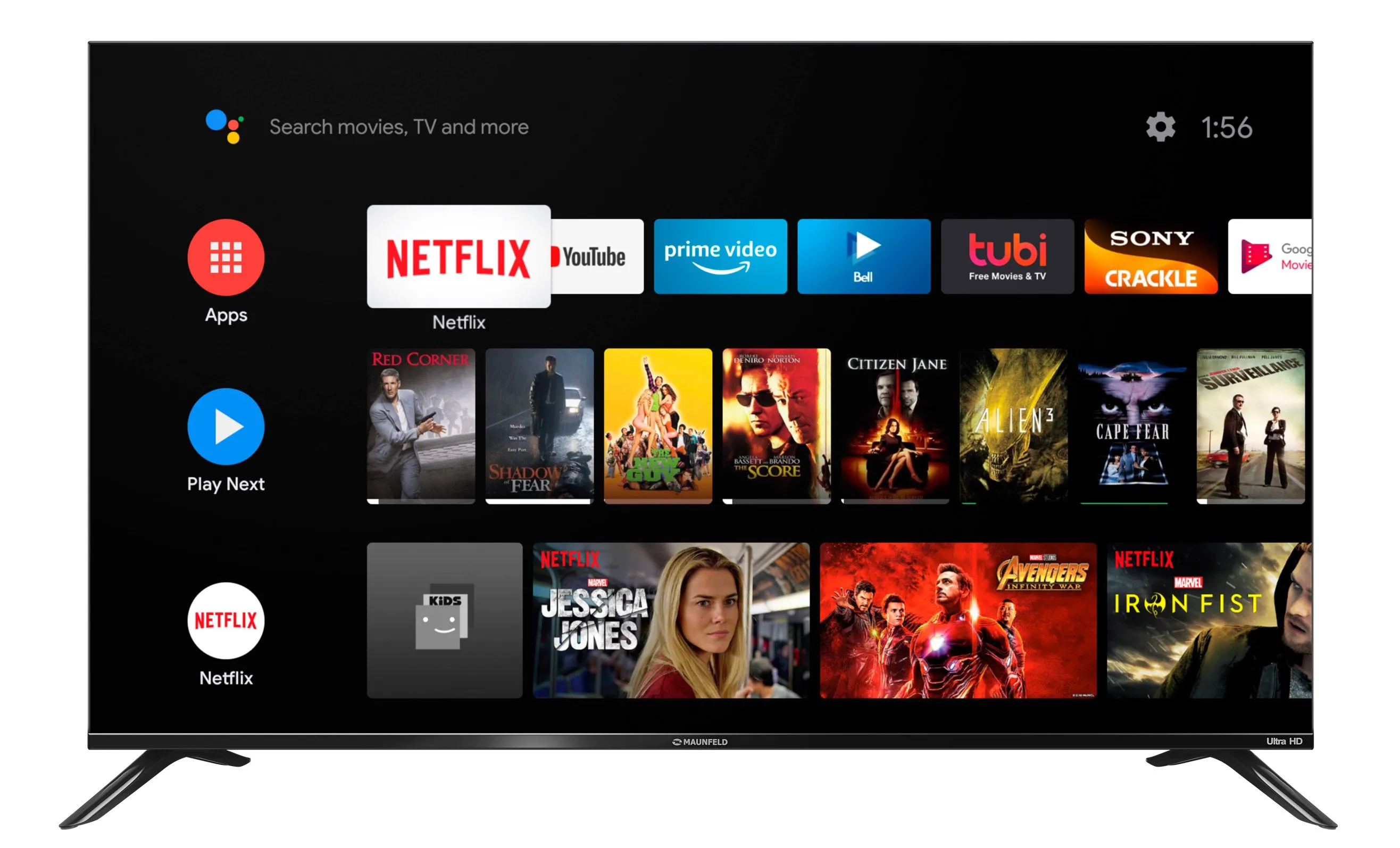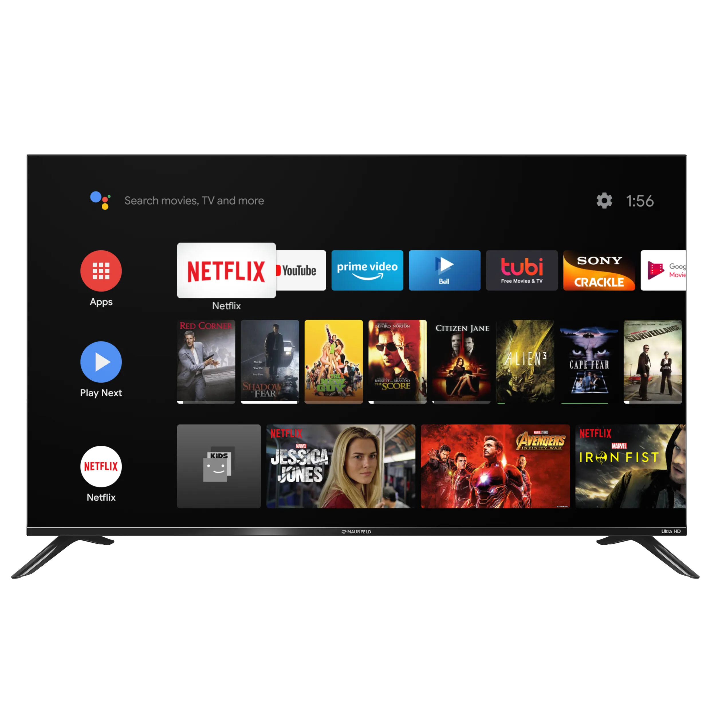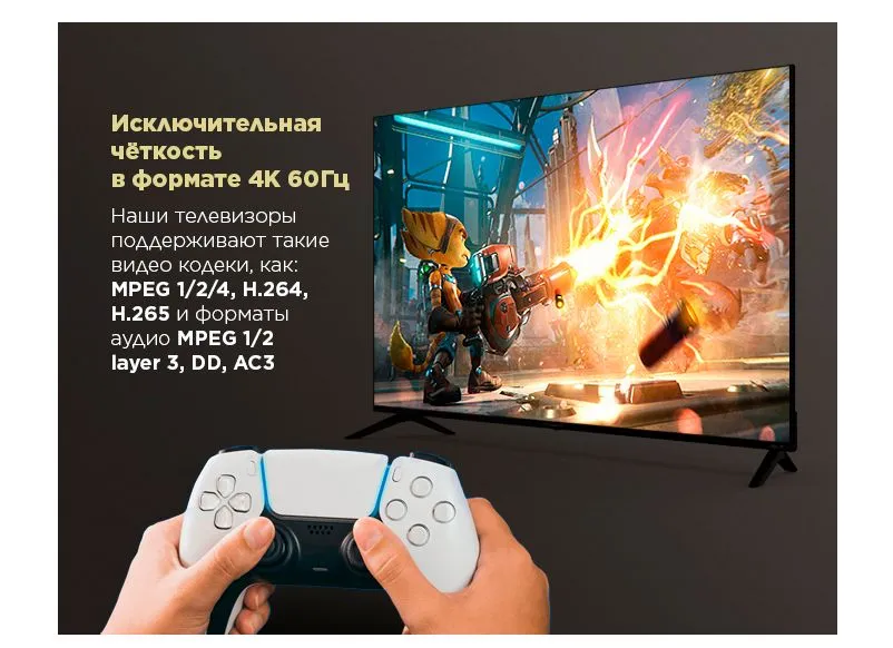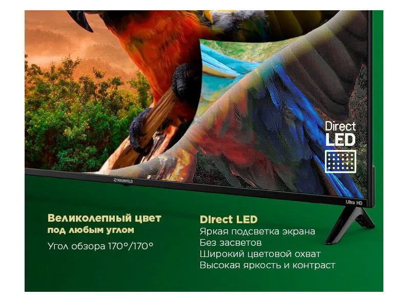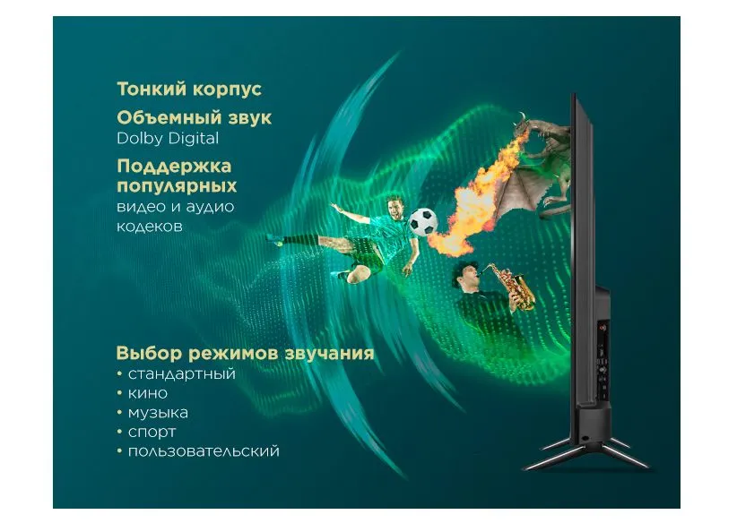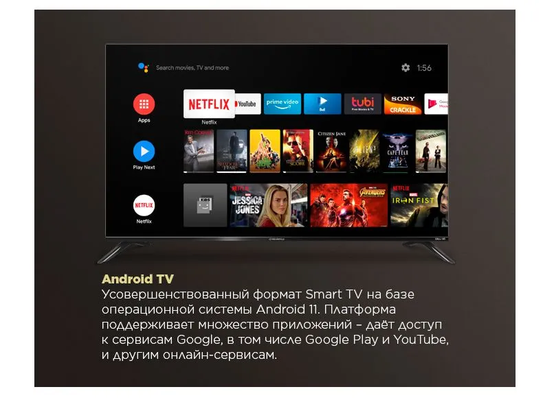 Телевизор LED с диагональю 55 дюймов на платформе Android 11. Широкоформатный экран 16:9 с разрешением Ultra HD и технологией Dolby Digital.