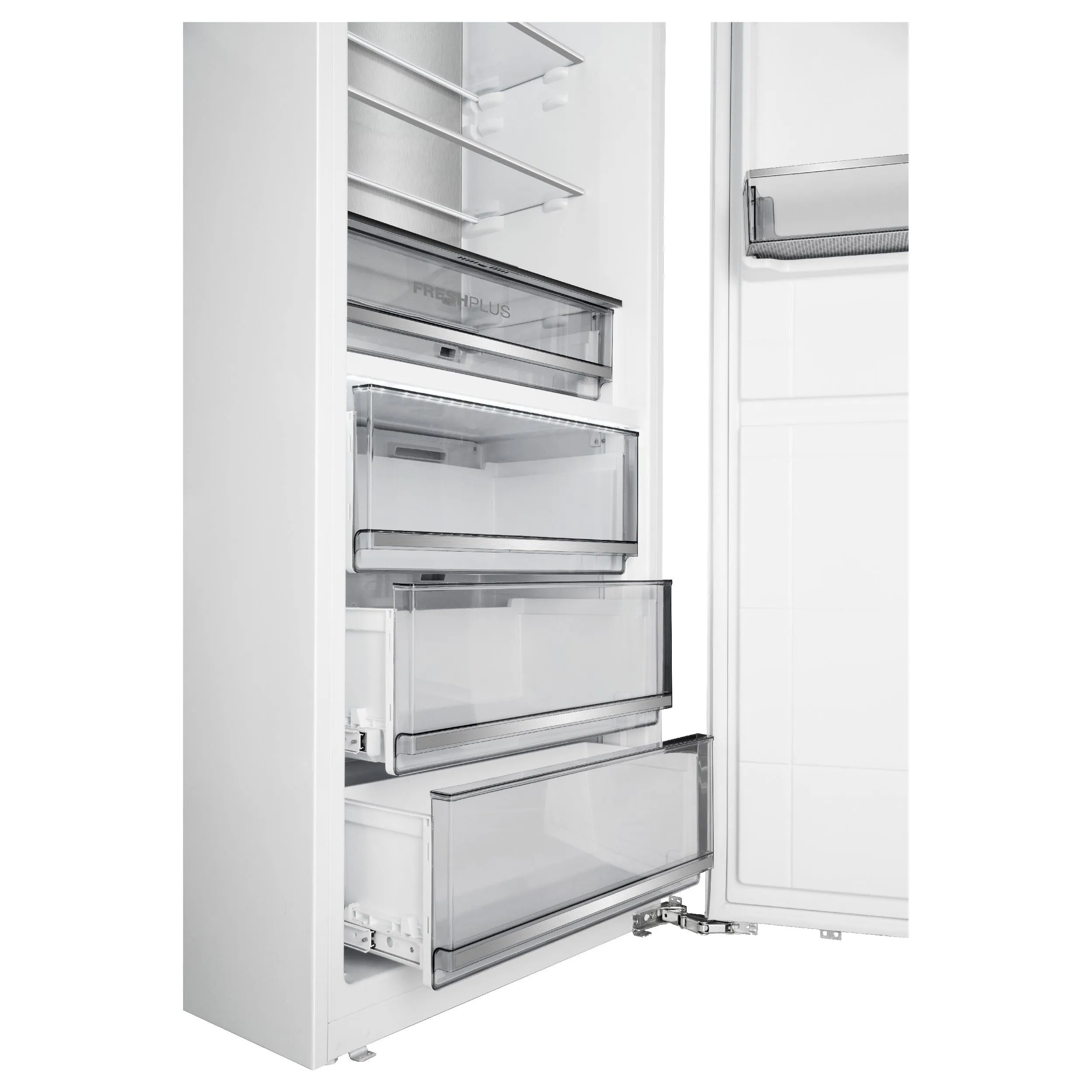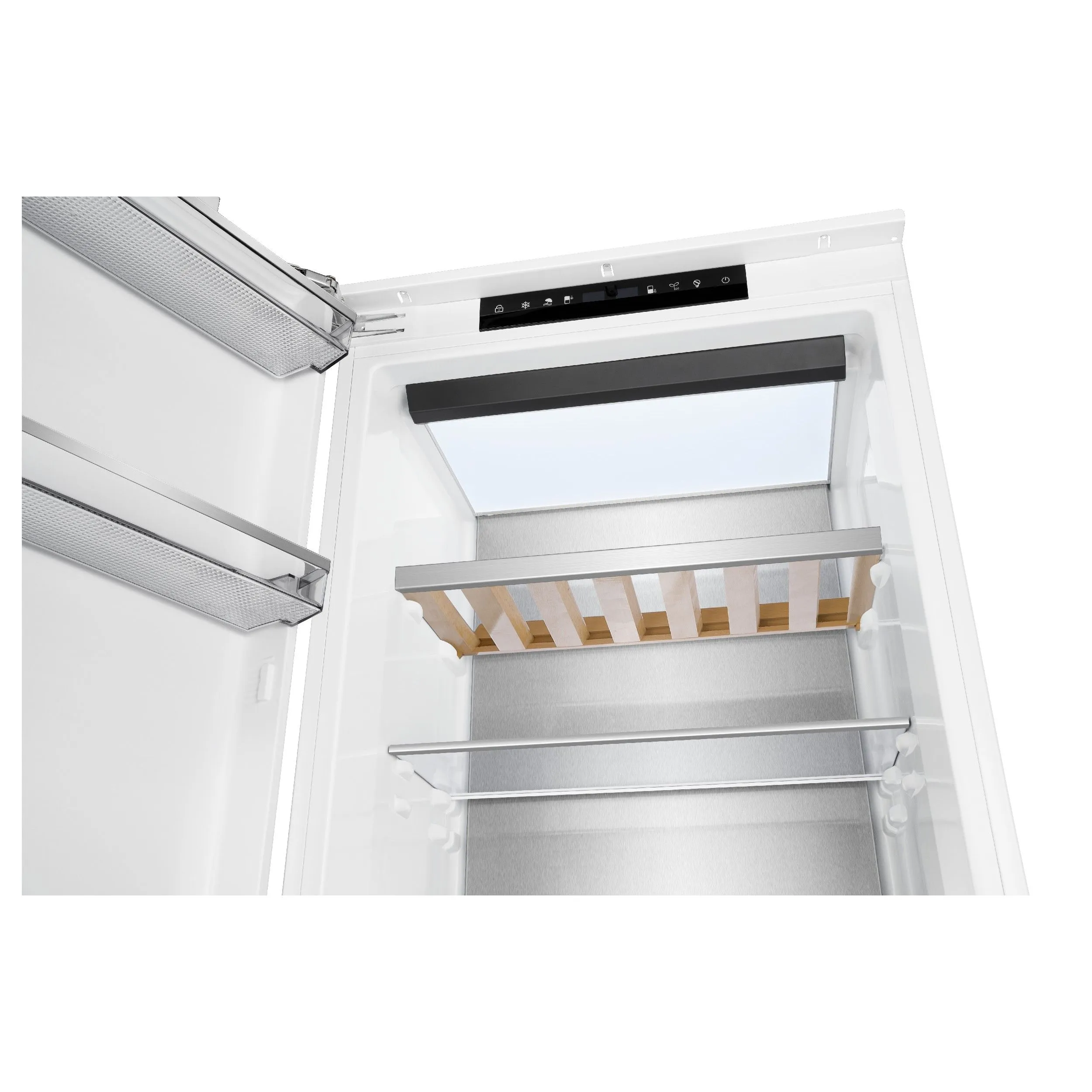 Встраиваемая холодильная камера, Инверторный компрессор, Система охлаждения No Frost, Электронное управление, Задняя стенка холодильного отделения Cold Metal, Ящик зоны свежести с механической регулировкой влажности, Раздельная регулировка температуры для верхней и нижней зон холодильника, Режим «Супер охлаждение», Режим “Отпуск”, LED подсветка по всей площади верхней части камеры, Ящики для фруктов и овощей,  Полки из закаленного стекла, Деревянная полка для  вина,  Класс энергопотребления: А+, Жесткое крепление двери, Перенавешиваемая дверь, Объем холодильного отделения: 330 л, Габаритные размеры (в/ш/г), 1937х690х550 мм