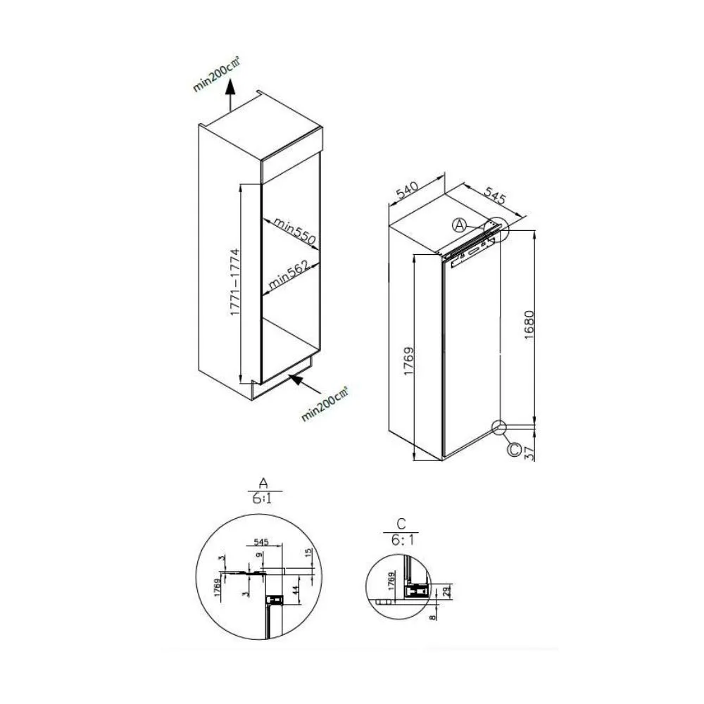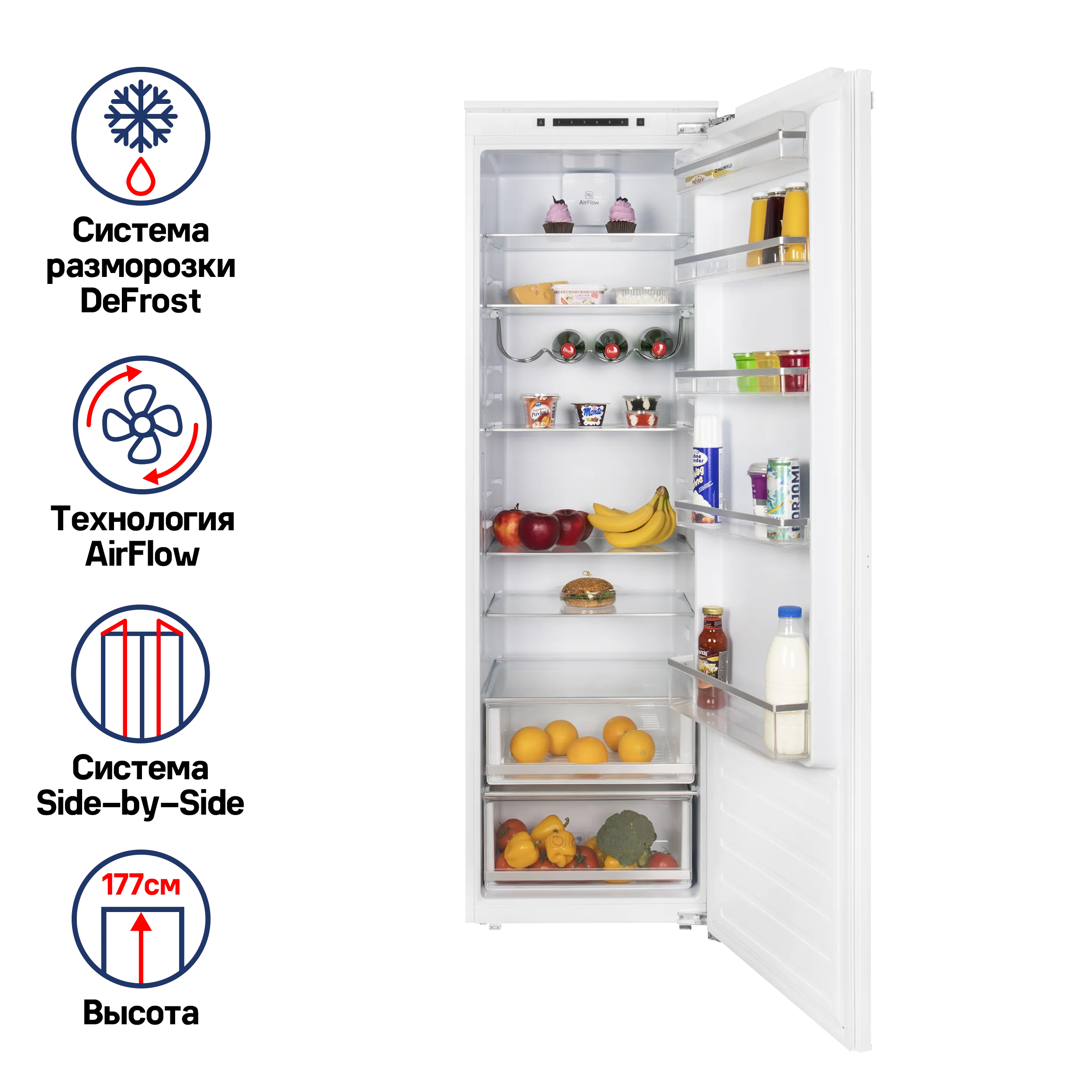 Современный встраиваемый однокамерный холодильник высотой 177 см. Статическое охлаждение холодильной камеры.