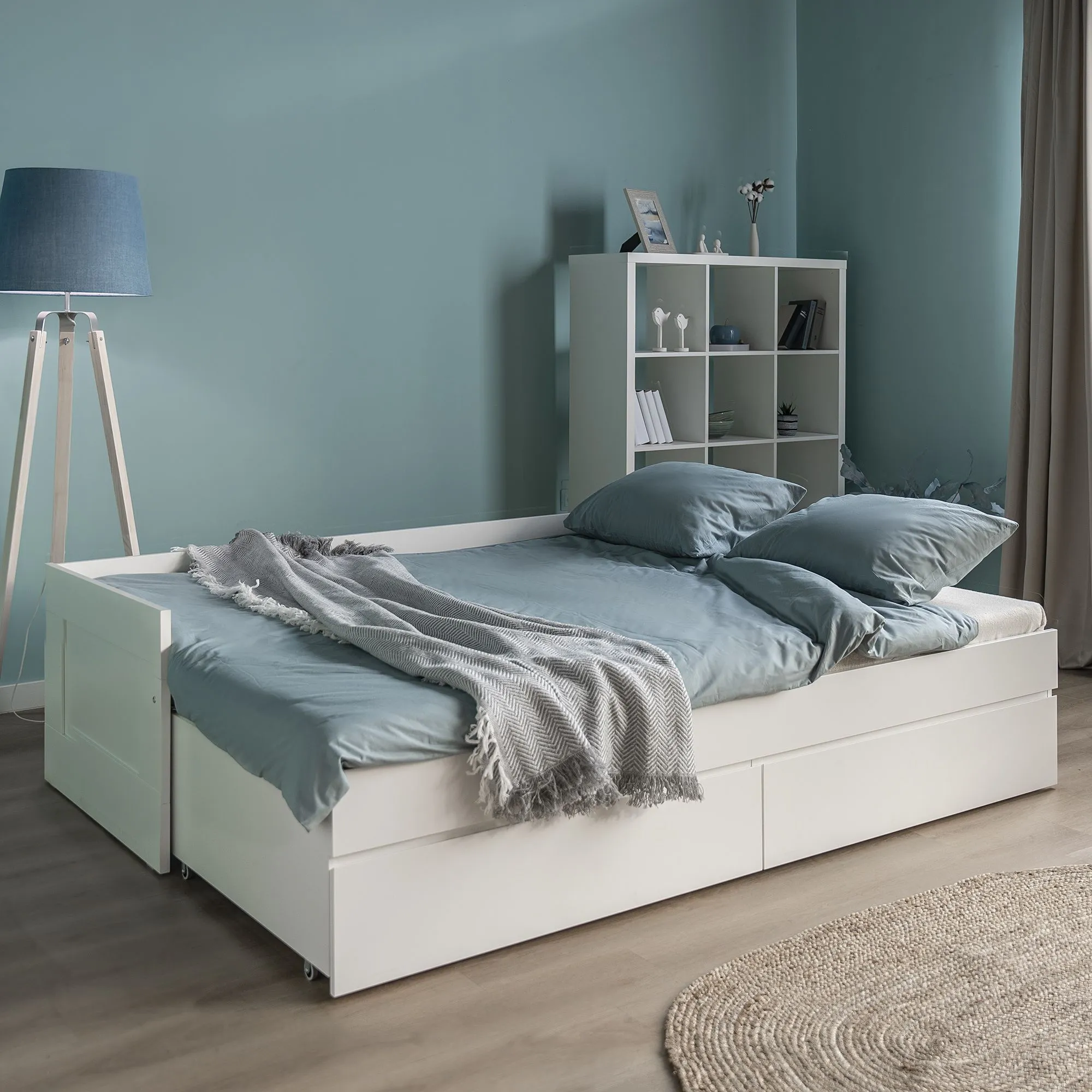 Кровать СИРИУС двухспальная раздвижная с двумя выдвижными ящиками для хранения, с ортопедическим основанием, 2044х870х575, цвет Белый. Спальное место 80/160х200. Изготовлена из кашированного ДСП толщиной 22 мм. Гарантийный срок для жилых помещений 18 месяцев, для общественных помещений - 12 месяцев.