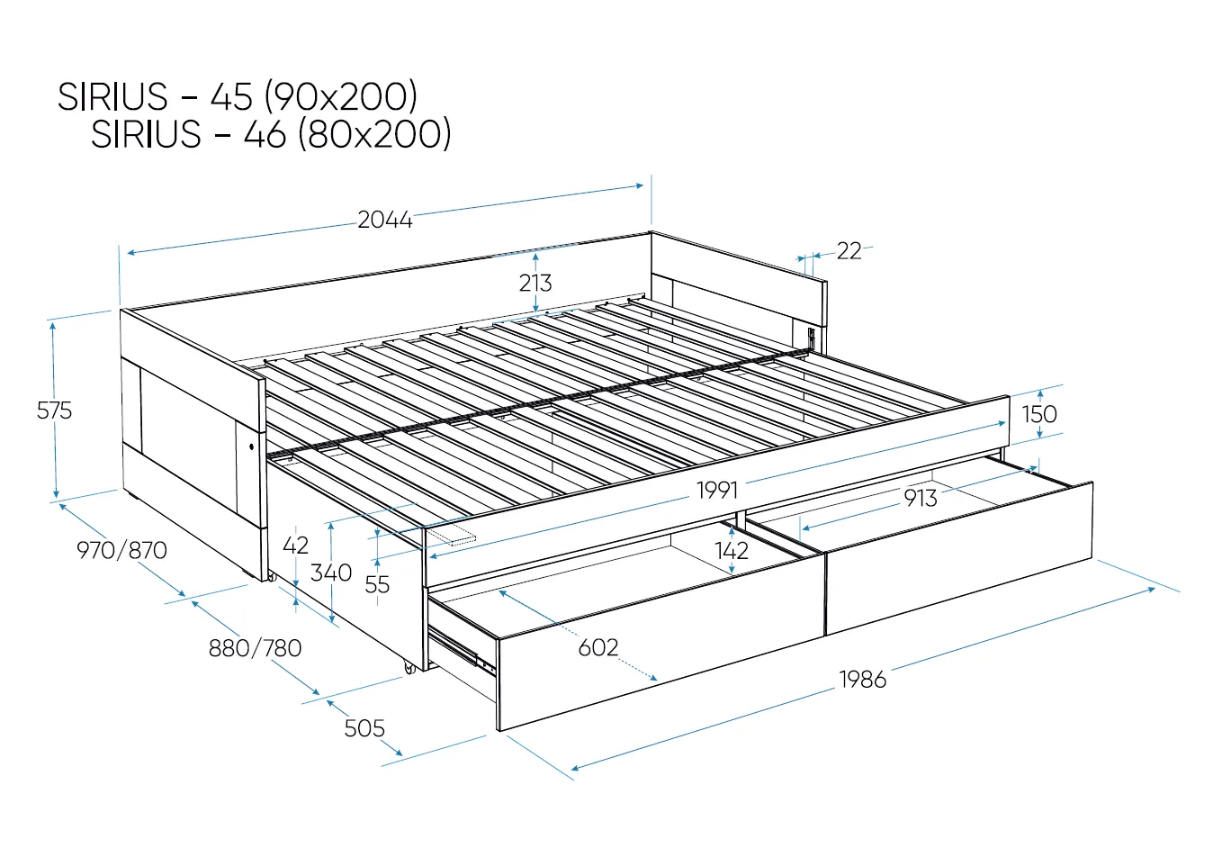 2.02.08.450.3 СИРИУС кровать раздвижная с ящиками 90х200 сонома RU