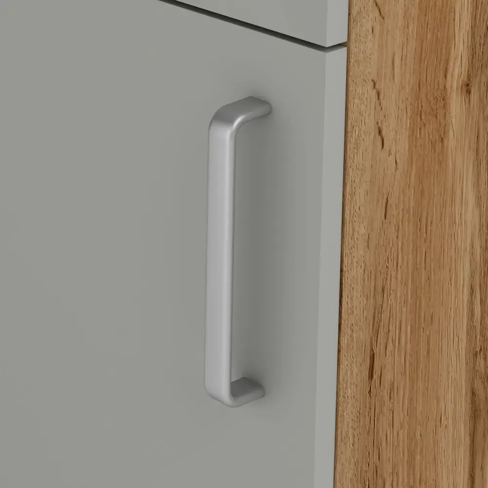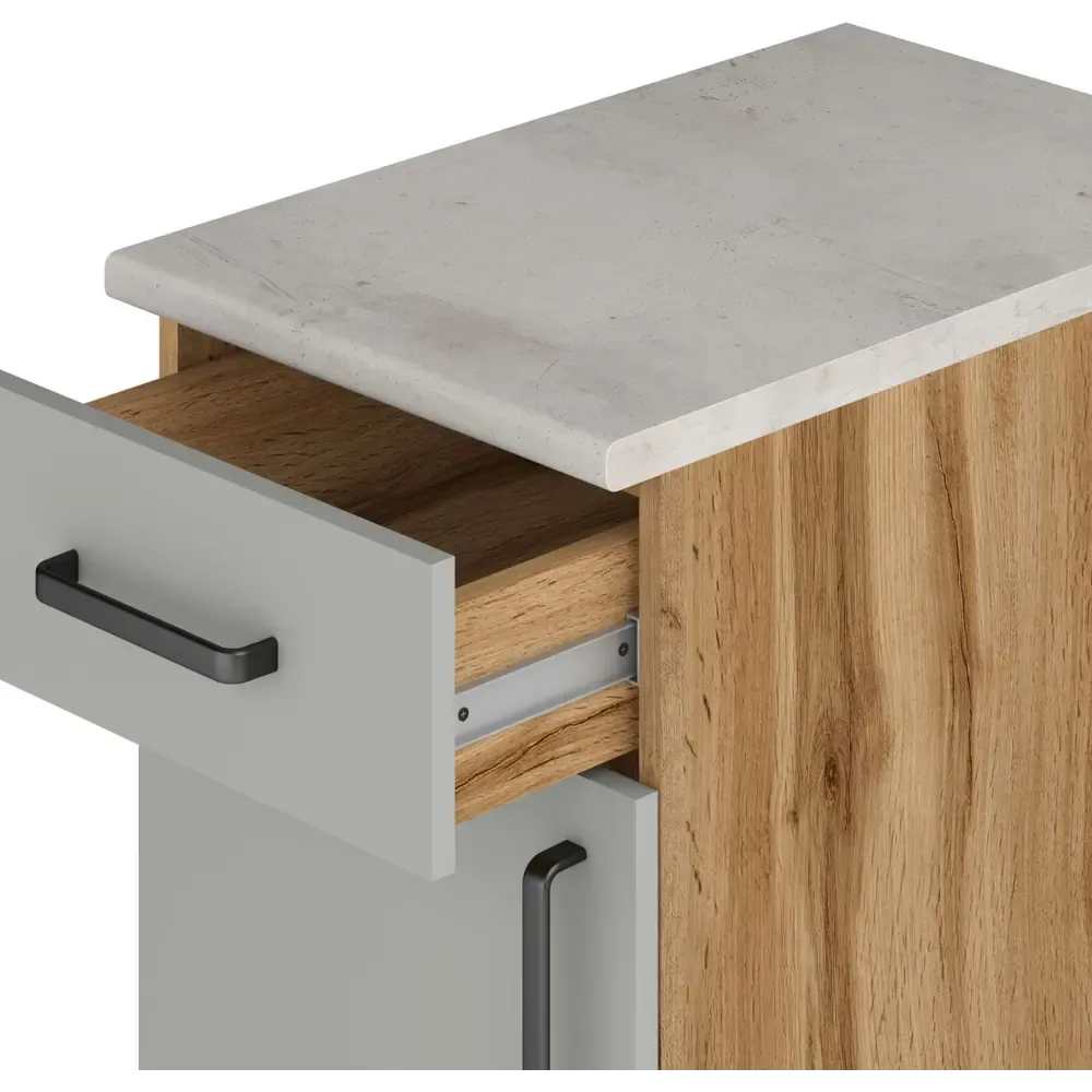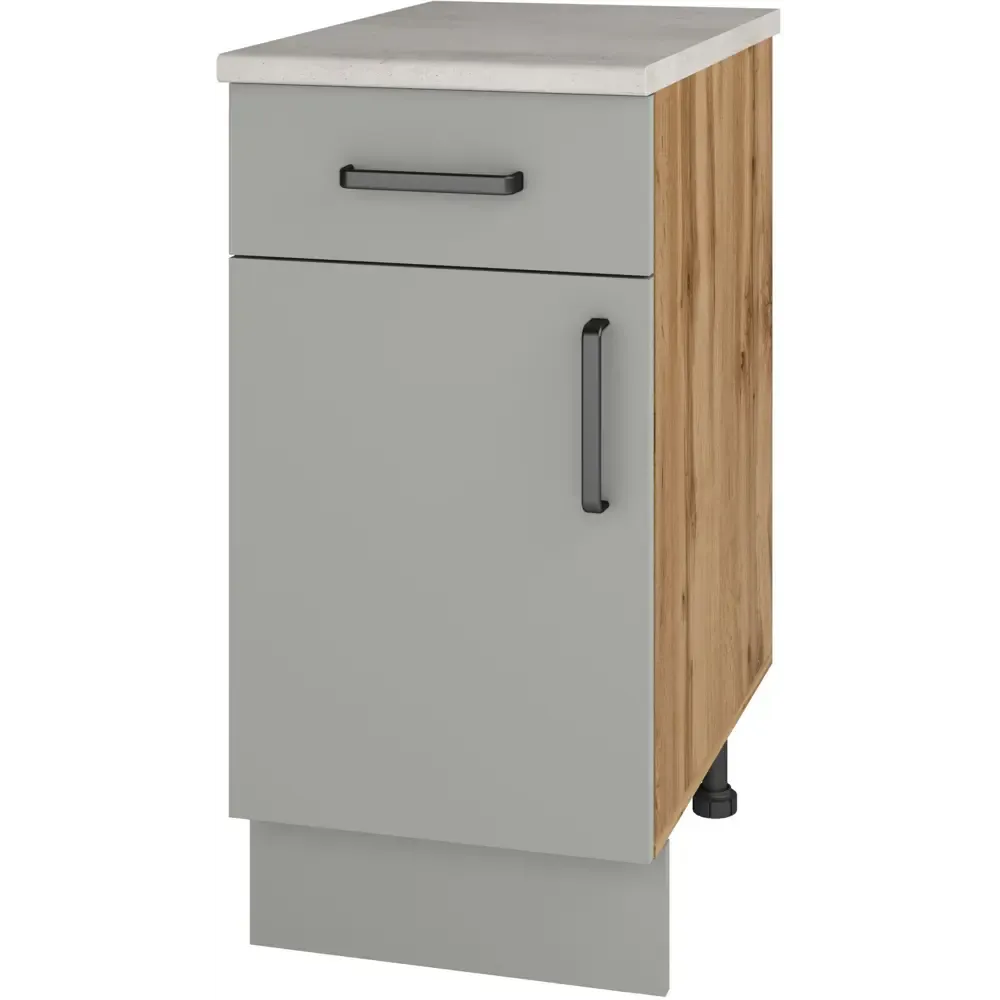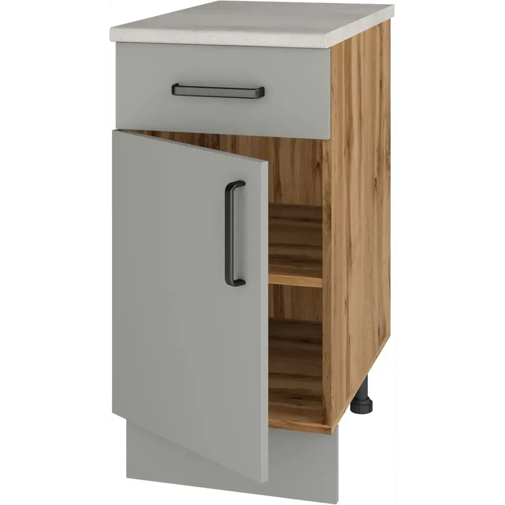 Кухонный напольный шкаф Мирах, цвет серый\дерево - это функциональный и стильный элемент кухонного интерьера. Он предназначен для хранения кухонной утвари, посуды и других необходимых предметов. Шкаф изготовлен из качественных материалов, включая ЛДСП и МДФ, что обеспечивает его долговечность и устойчивость к нагрузкам.