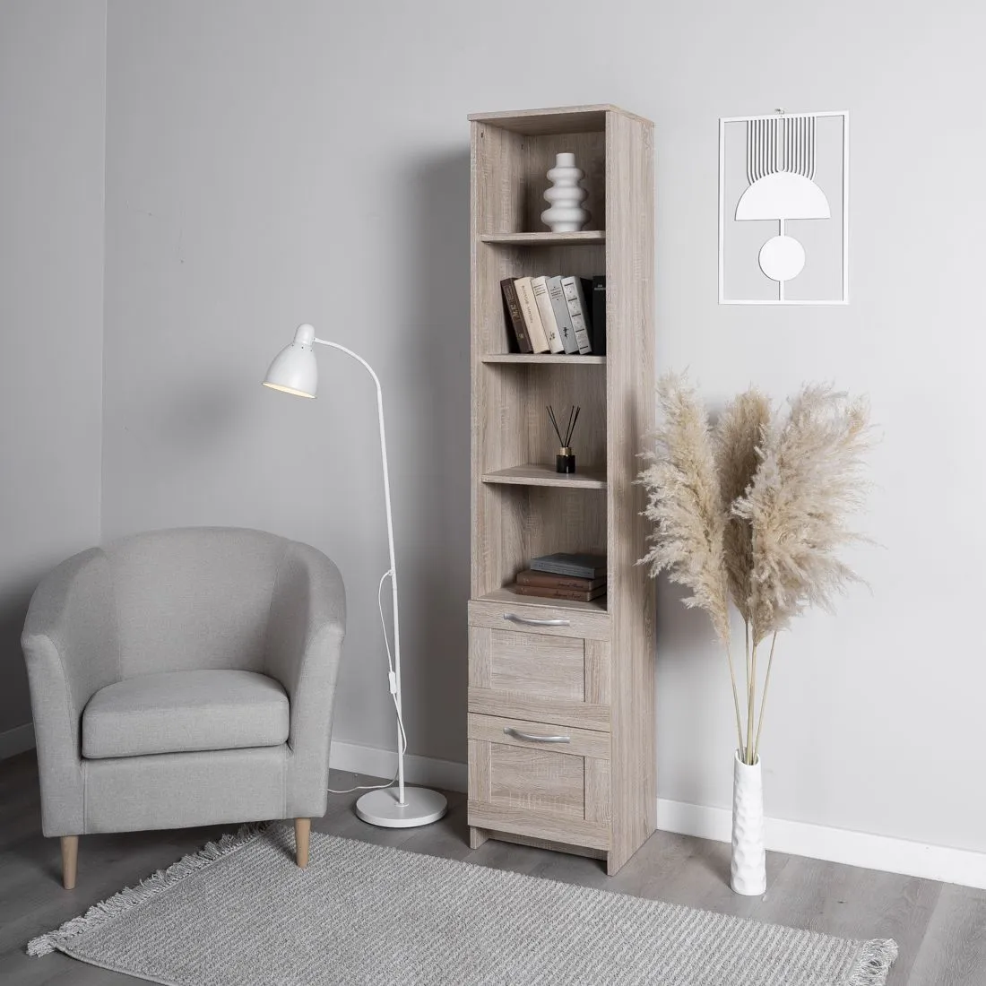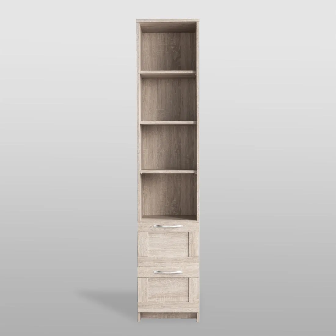Стеллаж СИРИУС узкий с четырьмя полками сверху и двумя выдвижными ящиками снизу, 392х348х1900, цвет Дуб Сонома. Изготовлен из кашированного ДСП толщиной 16 мм. Крепится к стене. Гарантийный срок для жилых помещений 24 месяца, для общественных помещений - 18 месяцев.