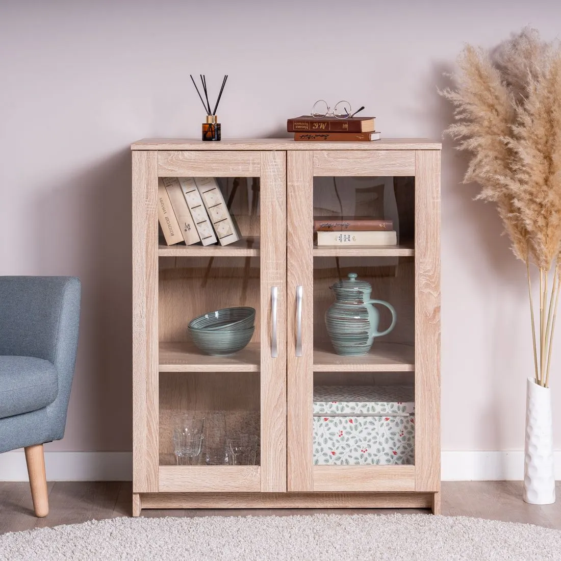 Тумба СИРИУС двухдверная с двумя стеклянными дверьми, 782х412х946, цвет Дуб Сонома. Изготовлена из кашированного ДСП толщиной 16 мм. Крепится к стене. Гарантийный срок для жилых помещений 24 месяца, для общественных помещений - 18 месяцев.