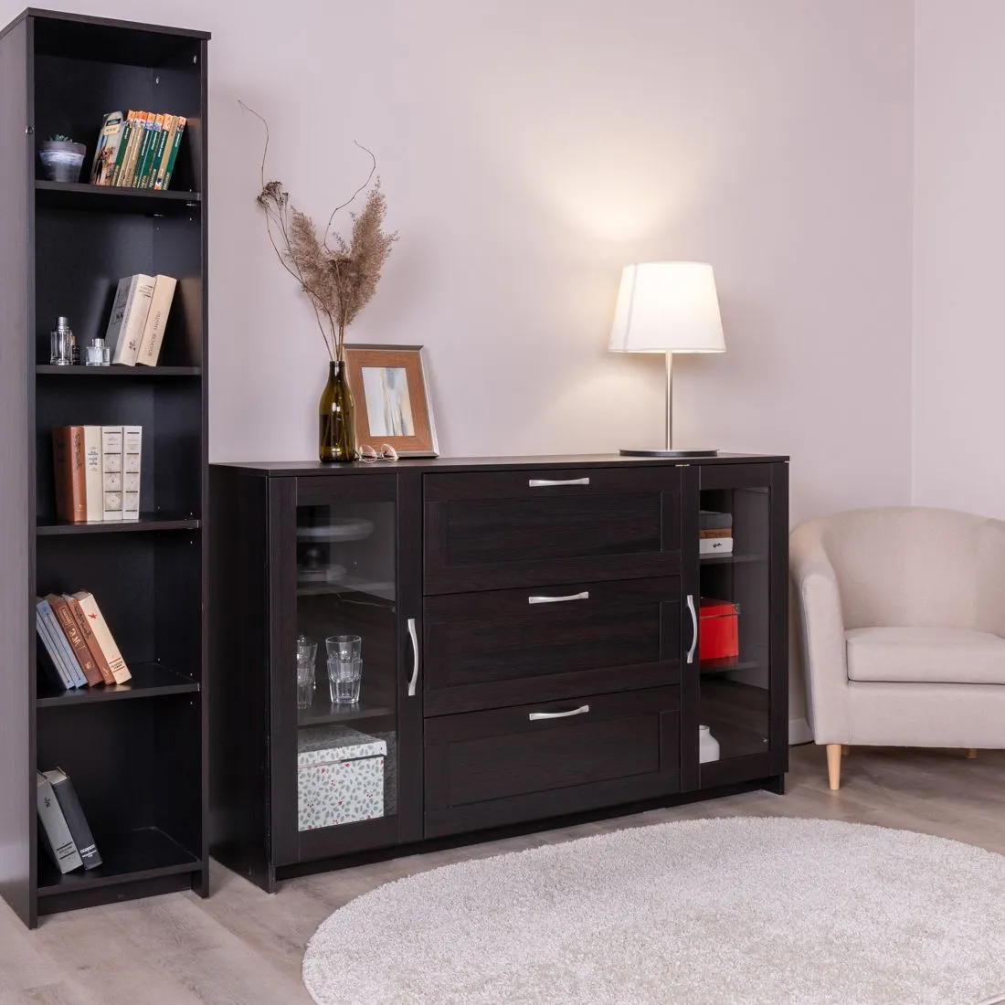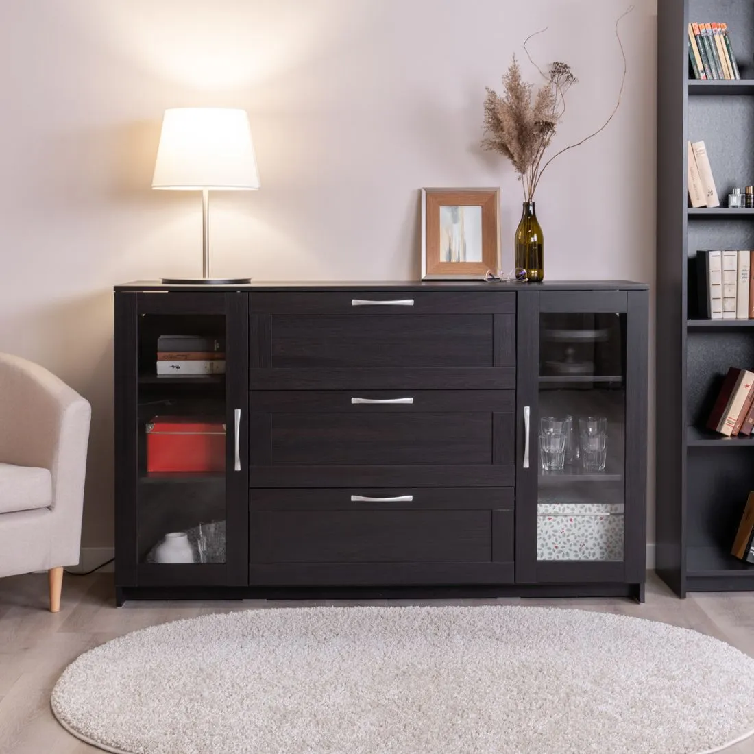 Тумба СИРИУС с двумя стеклянными дверьми и тремя ящиками, 1560х412х946, цвет Дуб Венге. Изготовлена из кашированного ДСП толщиной 16 мм. Крепится к стене. Гарантийный срок для жилых помещений 24 месяца, для общественных помещений - 18 месяцев.