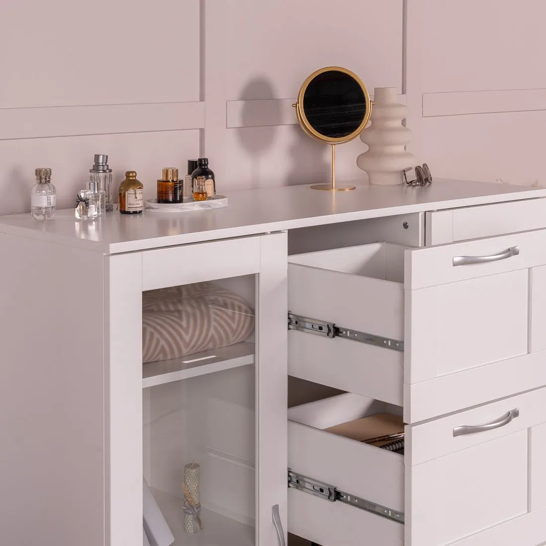 Тумба СИРИУС с двумя стеклянными дверьми и четырьмя ящиками, 1171х412х1234, цвет Белый. Изготовлена из кашированного ДСП толщиной 16 мм. Крепится к стене. Гарантийный срок для жилых помещений 24 месяца, для общественных помещений - 18 месяцев.