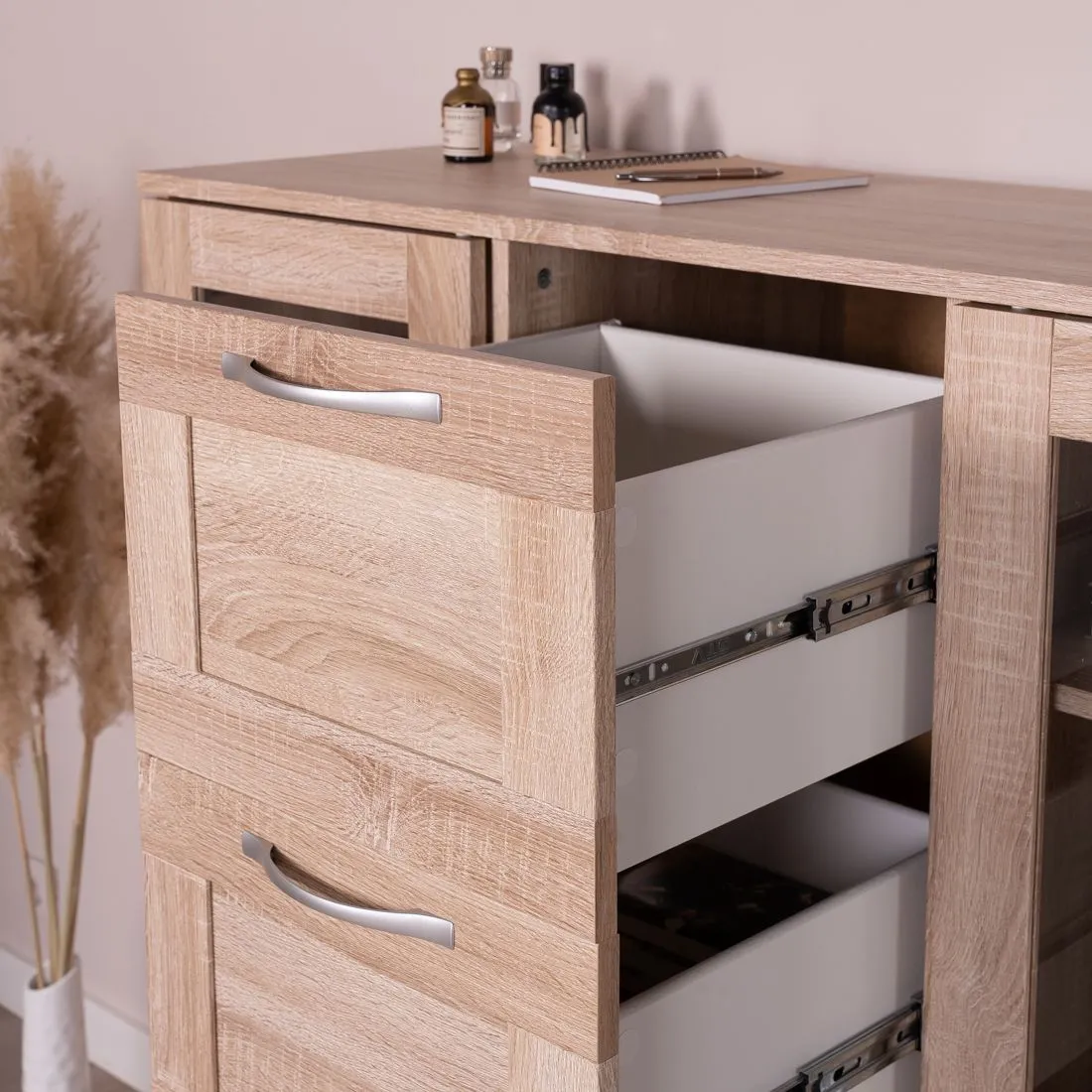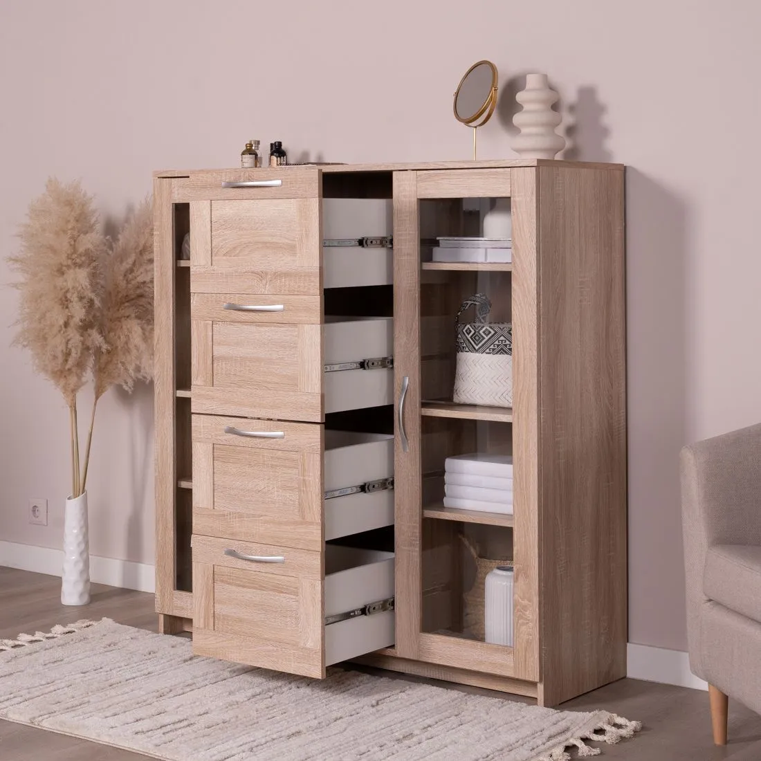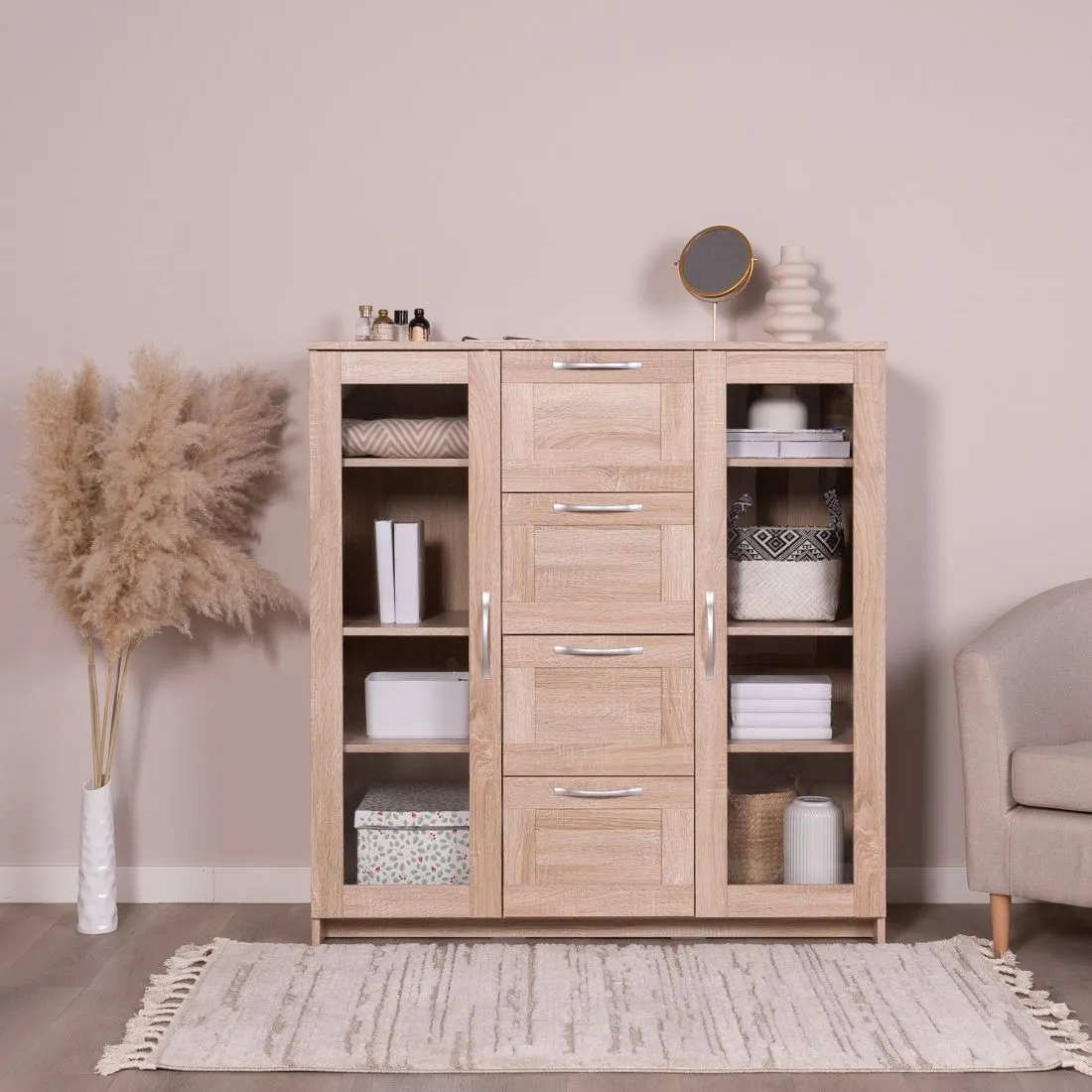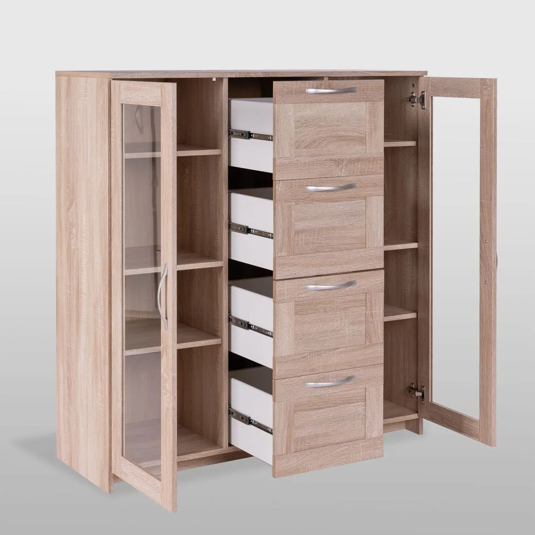 Тумба СИРИУС с двумя стеклянными дверьми и четырьмя ящиками, 1171х412х1234, цвет Дуб Сонома. Изготовлена из кашированного ДСП толщиной 16 мм. Крепится к стене. Гарантийный срок для жилых помещений 24 месяца, для общественных помещений - 18 месяцев.