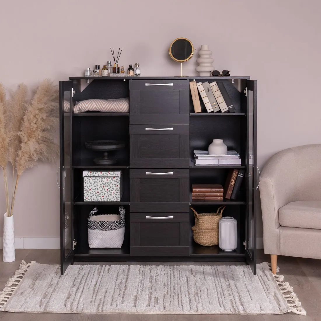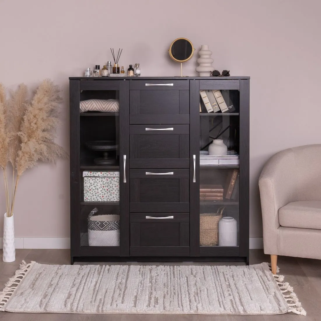Тумба СИРИУС с двумя стеклянными дверьми и четырьмя ящиками, 1171х412х1234, цвет Дуб Венге. Изготовлена из кашированного ДСП толщиной 16 мм. Крепится к стене. Гарантийный срок для жилых помещений 24 месяца, для общественных помещений - 18 месяцев.