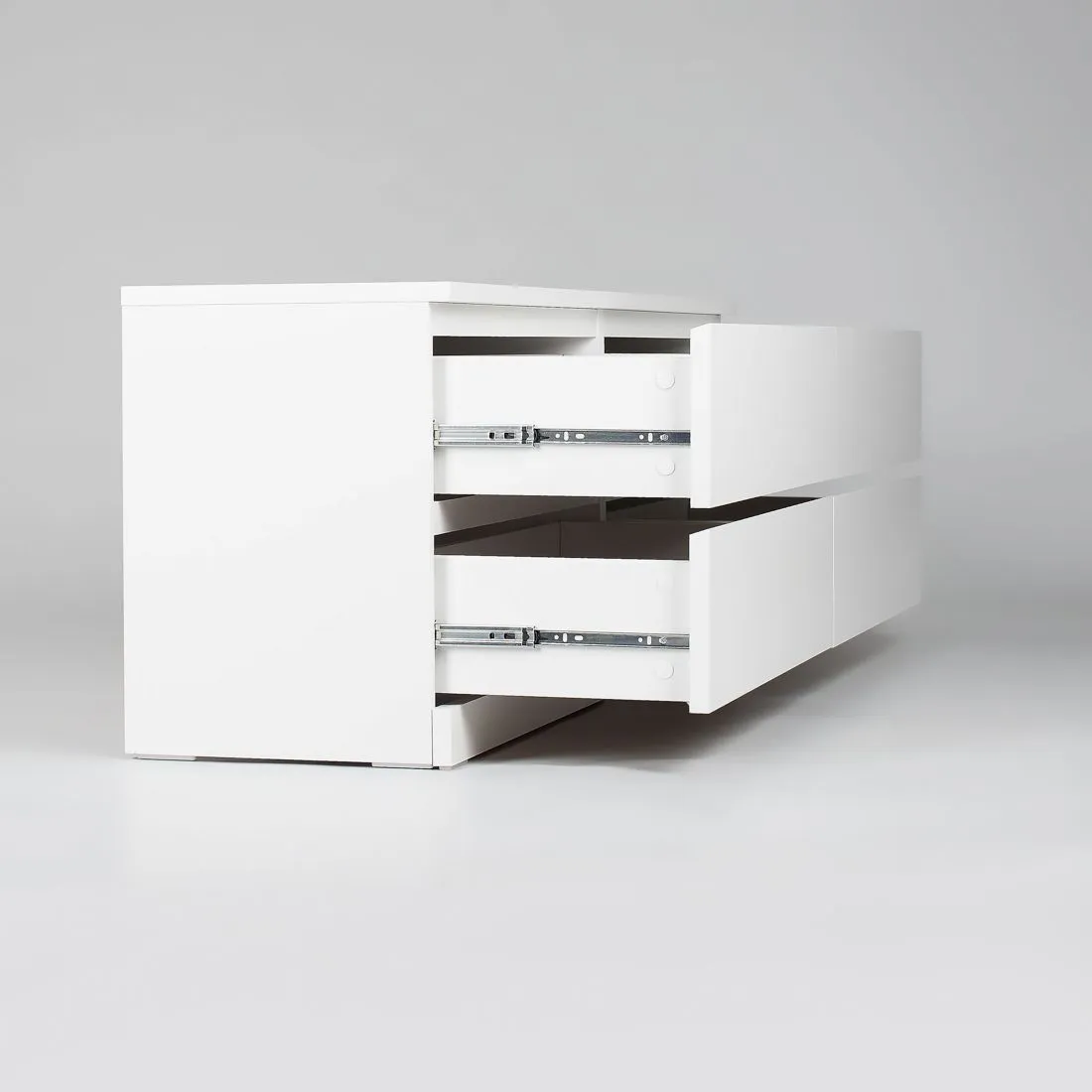 Отлично сочетается в интерьере со стеллажами и полками Фора, журнальными столиками и ТВ-тумбами Энкель, стеллажами Варма. Доступен к заказу не только в белом цвете, но и с покрытием натуральным шпоном (беленый дуб, черный).