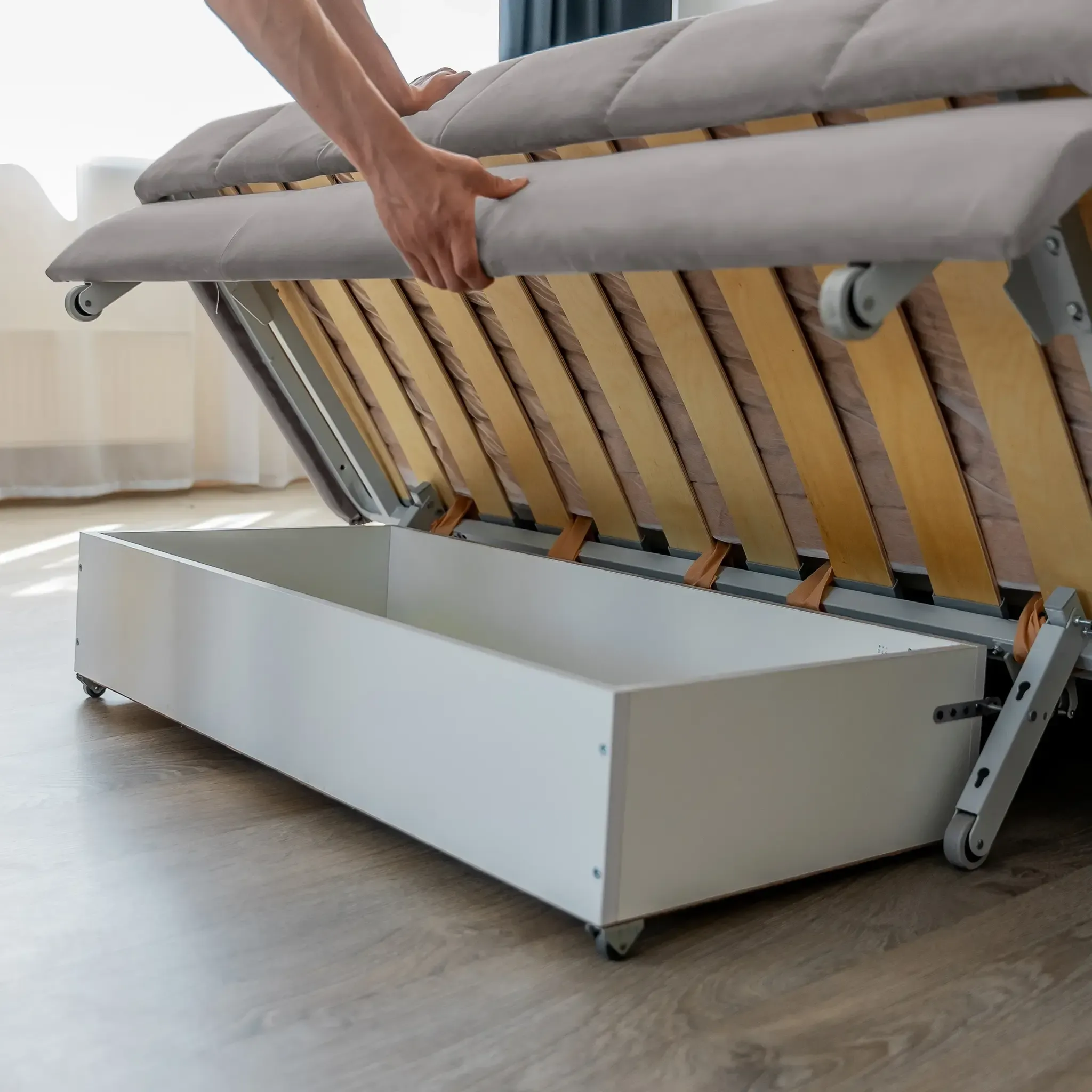 Лёгкая трансформация. Чтобы сложить кровать, достаточно поднять основание до щелчка и задвинуть механизм. Раскладывание происходит одним лёгким движением. Лёгкость обеспечивают прорезиненные колёсики и специальный механизм аккордеонного типа.