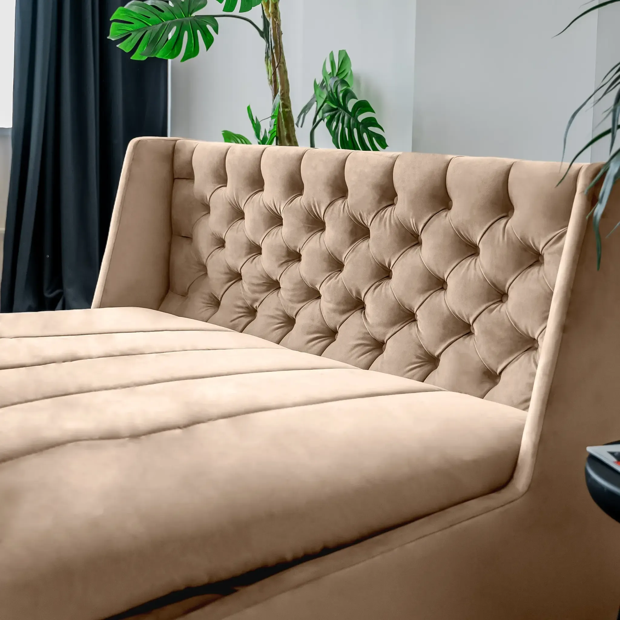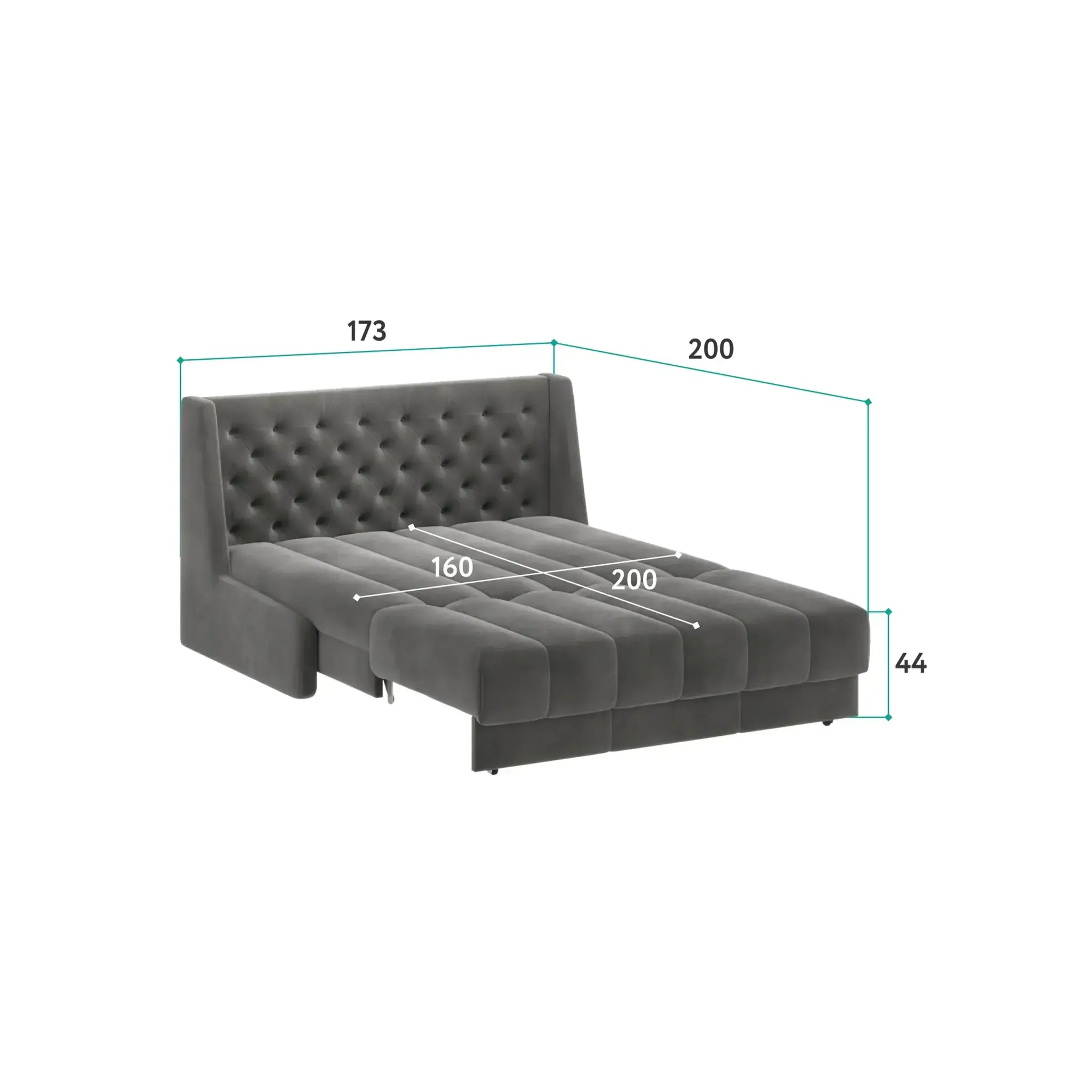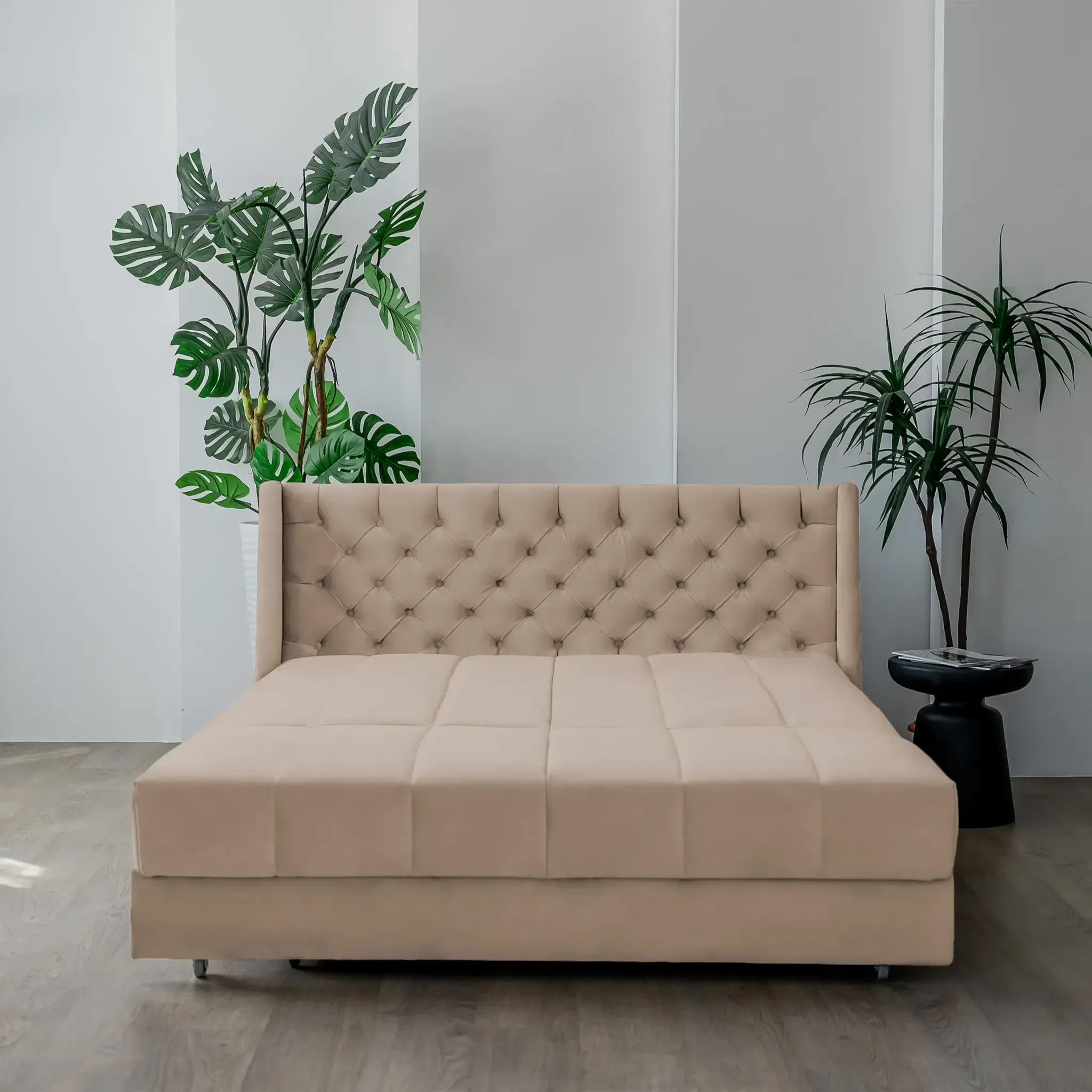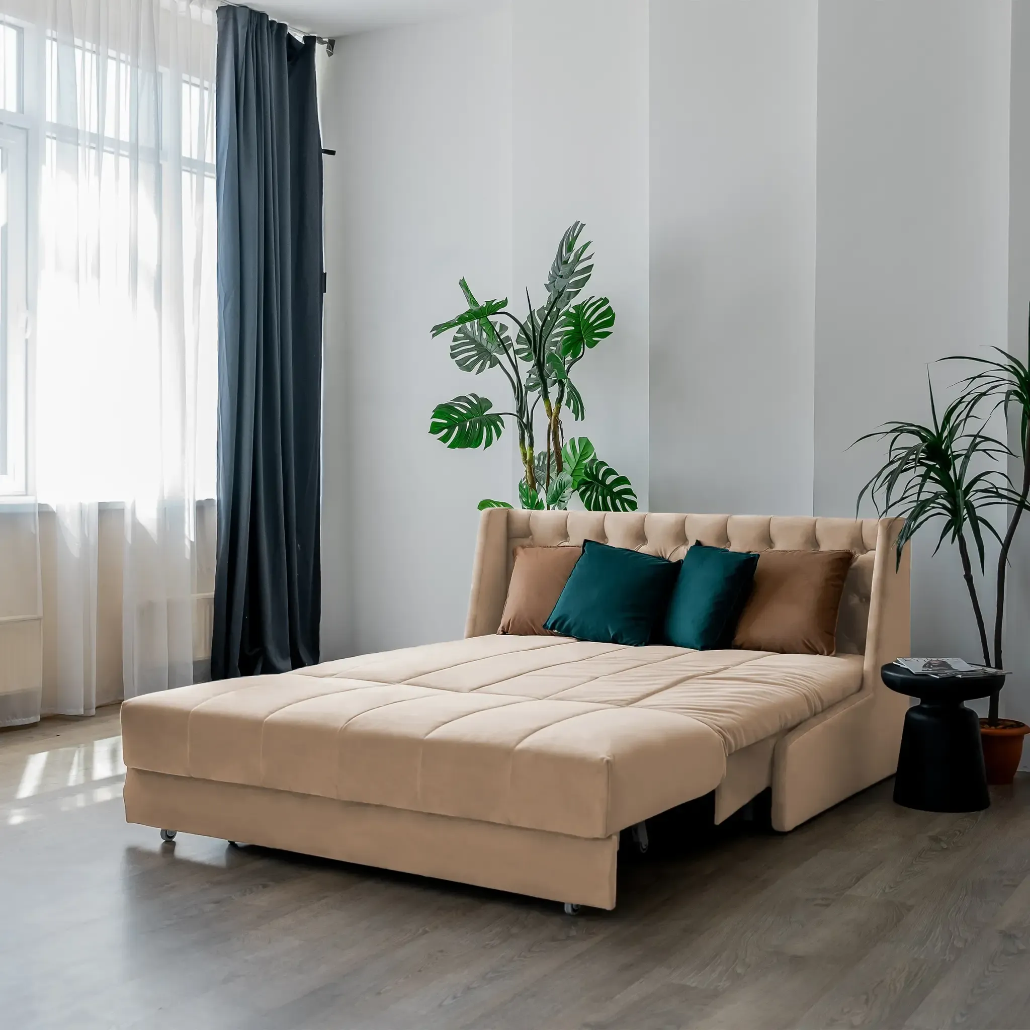 Эстетика дизайна. Высокая спинка с каретной стяжкой делает складную кровать стильной деталью интерьера. А спинка в основной ткани позволяет использовать её для зонирования пространства.