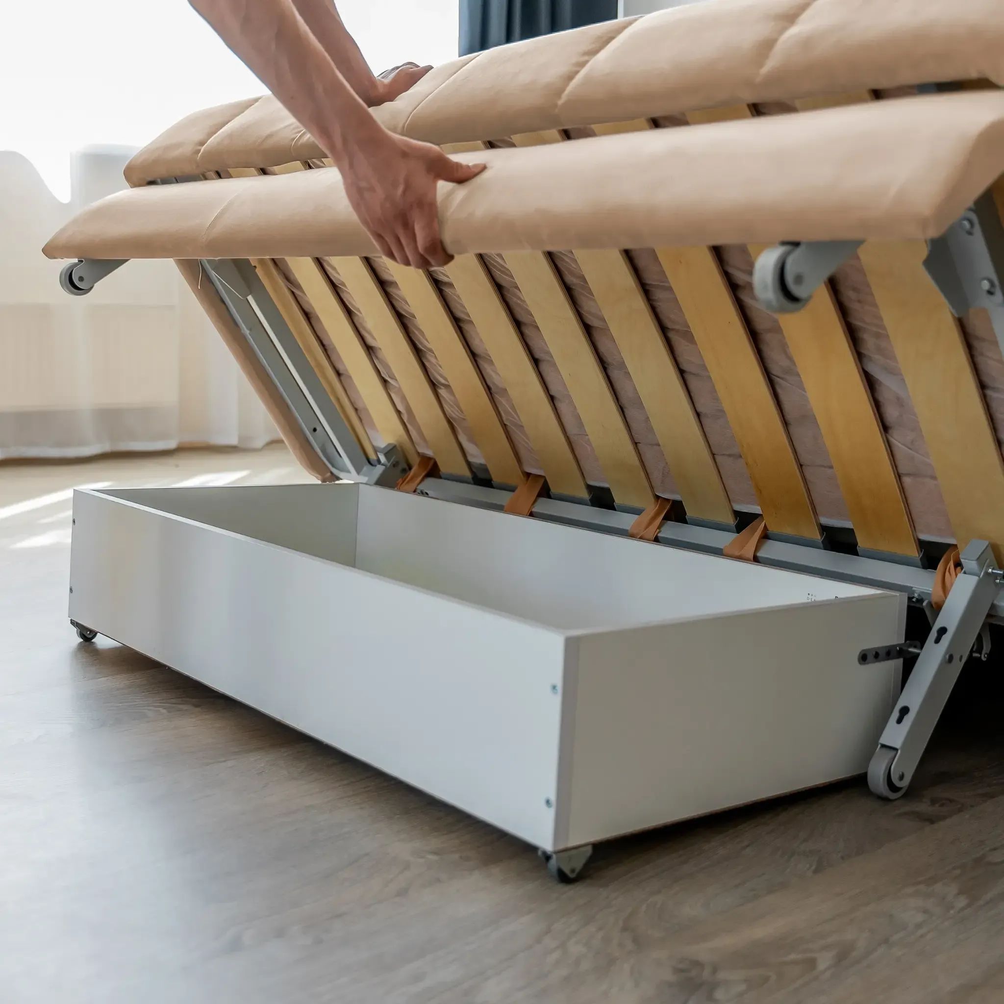 Лёгкая трансформация. Чтобы сложить кровать, достаточно поднять основание до щелчка и задвинуть механизм. Раскладывание происходит одним лёгким движением. Лёгкость обеспечивают прорезиненные колёсики и специальный механизм аккордеонного типа.