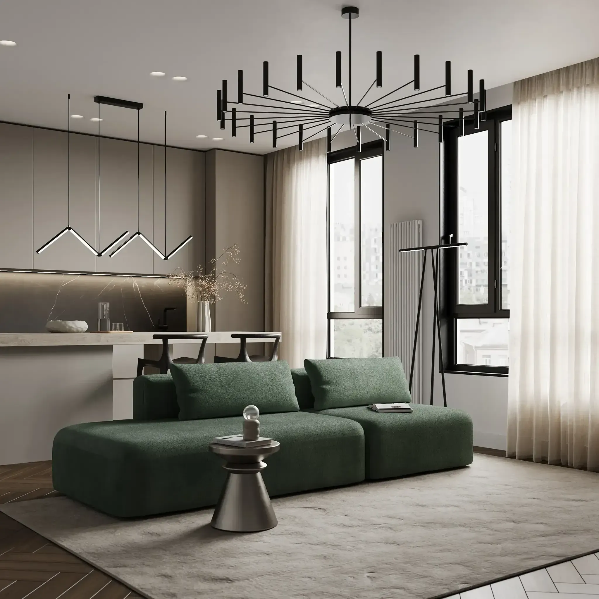 Дизайн дивана выполнен в современном стиле, который подойдет для интерьеров в стиле джапанди и минимализм. Округлые формы и широкие подлокотники создают ощущение уюта и комфорта. Вытянутые в горизонталь летящие силуэты дивана и асимметрия придают ему современное обличие.