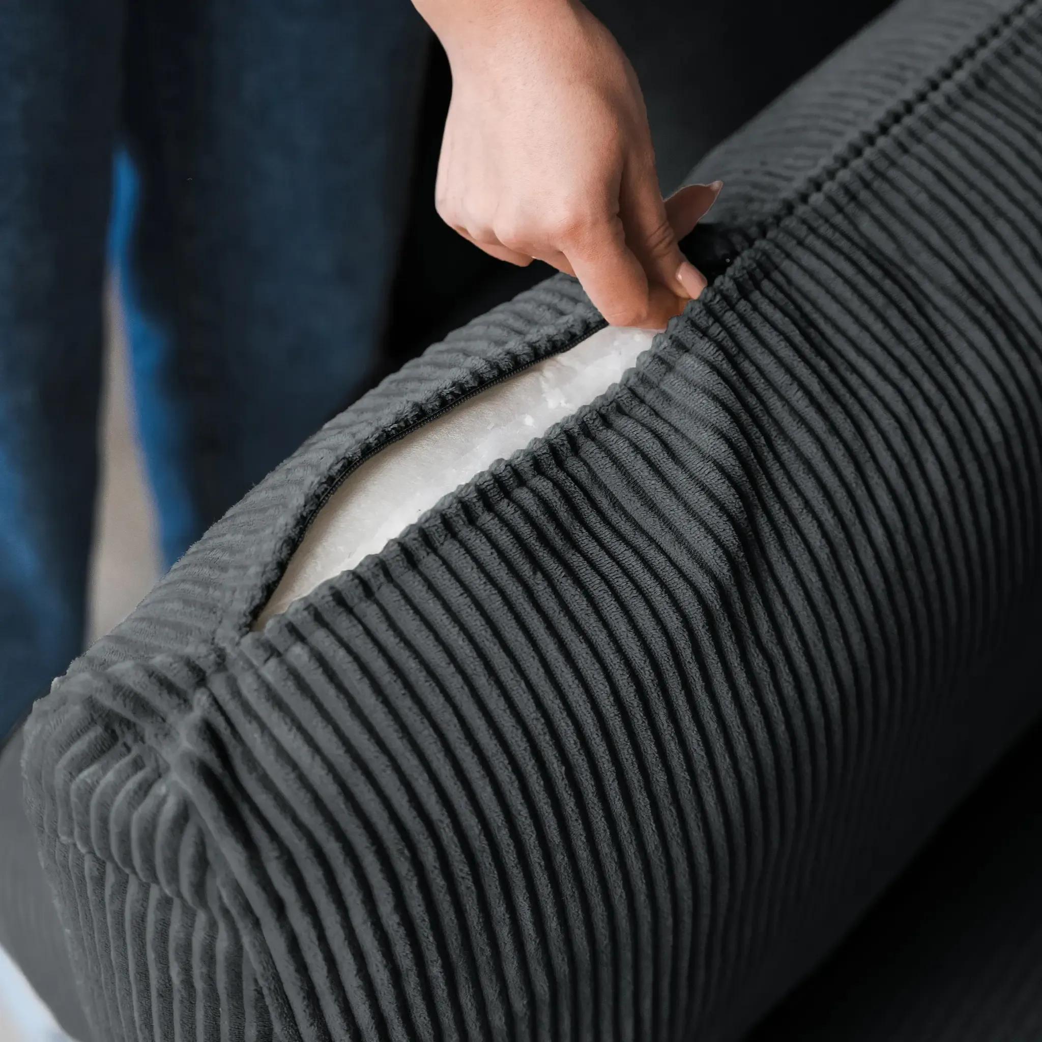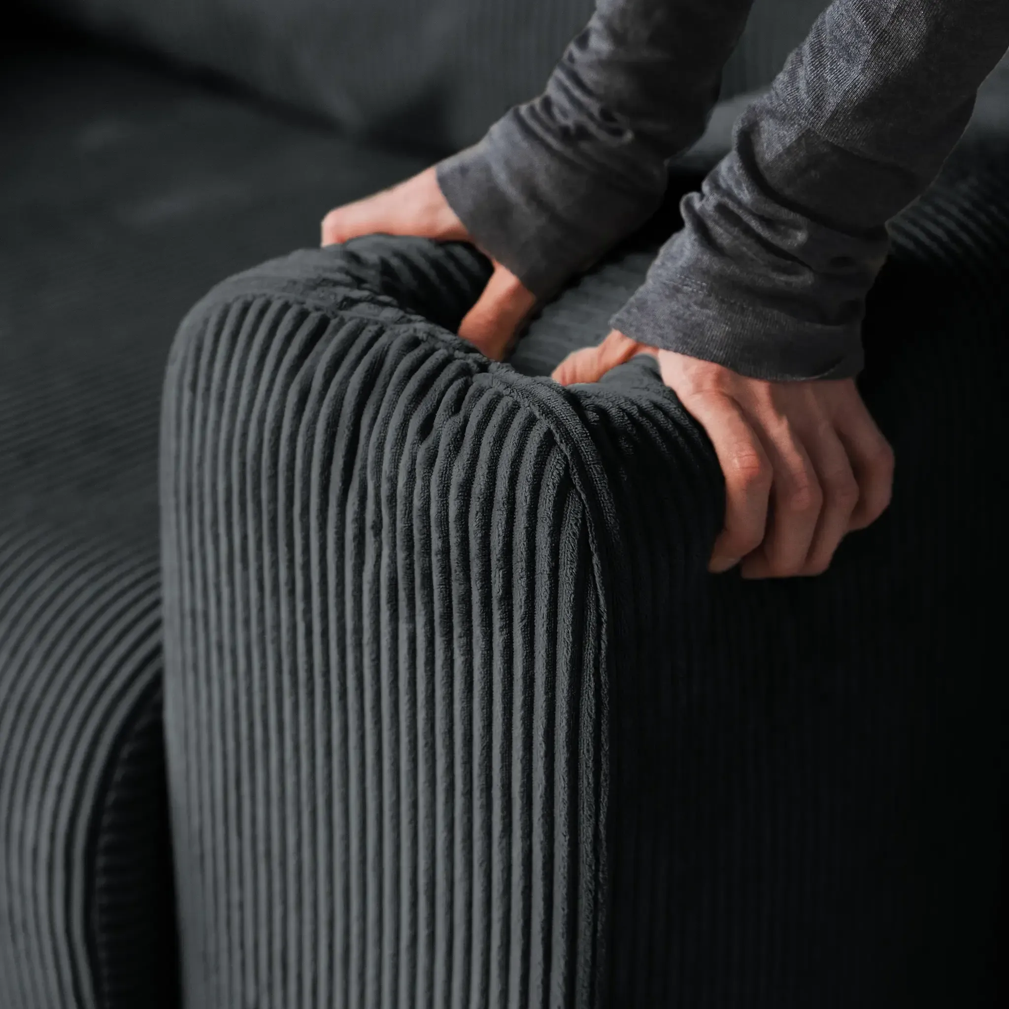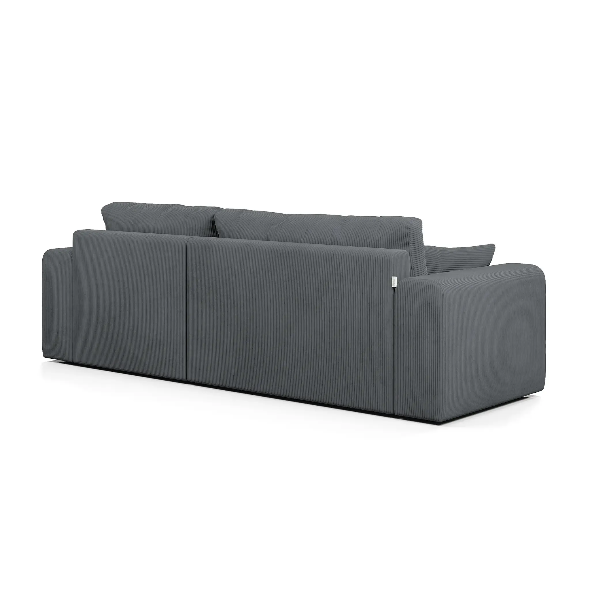 Универсальный угол дивана позволяет адаптировать его под любую планировку комнаты, а мягкий велюр CILIUM с рельефной фактурой добавляет интерьеру уюта и изысканности. Базовая обивка спинки делает диван универсальным элементом зонирования, создавая уютные уголки для отдыха или общения. В комплекте с диваном вы получаете набор стильных декоративных подушек.