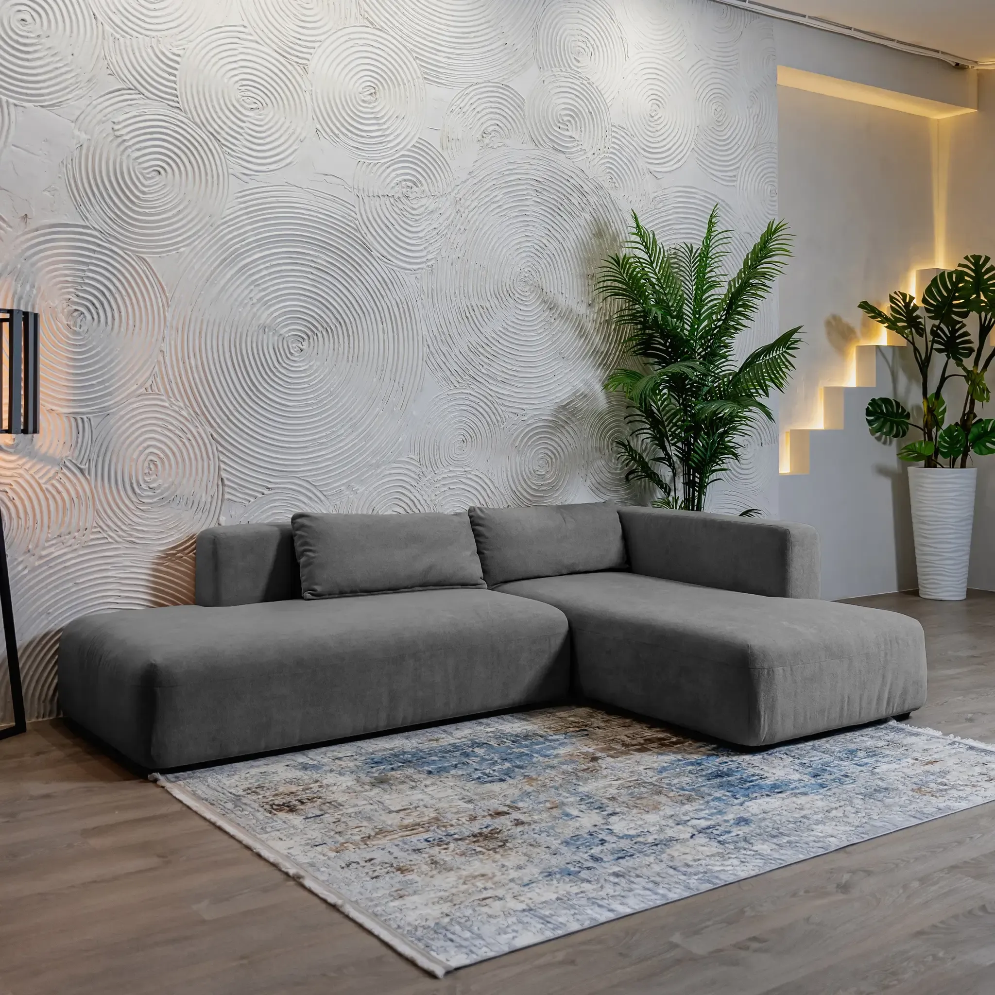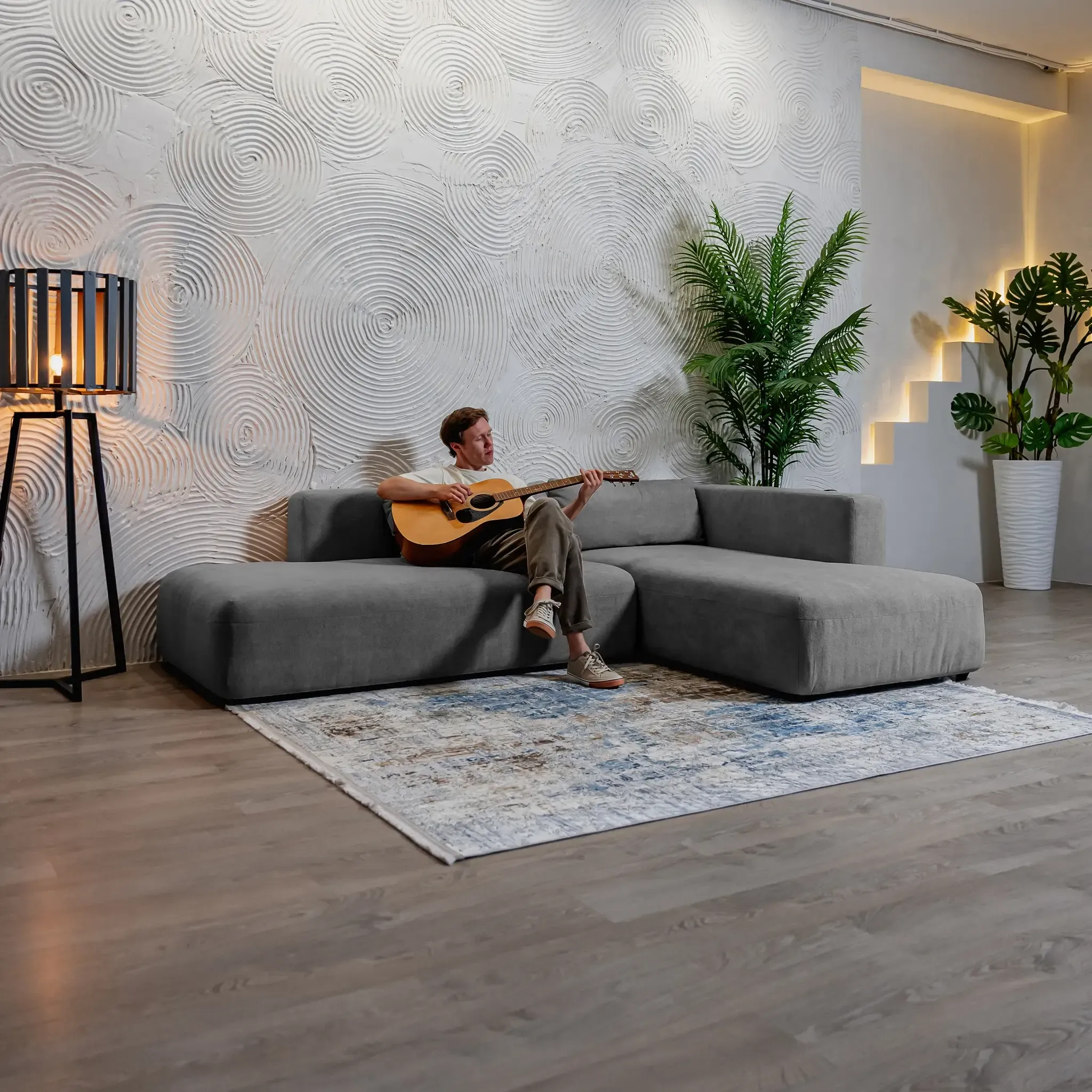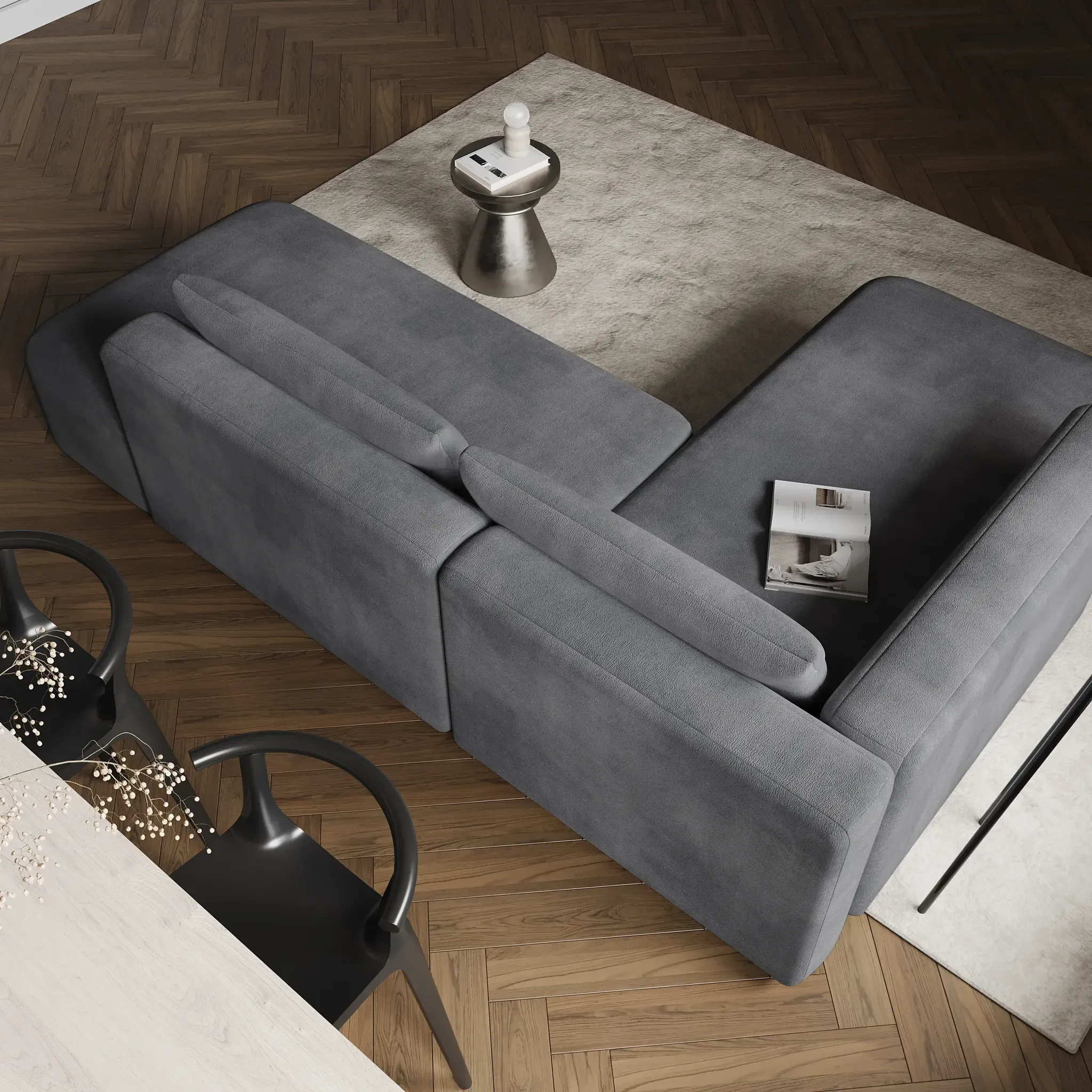 Дизайн дивана выполнен в современном стиле, который подойдет для интерьеров в стиле джапанди и минимализм. Округлые формы и широкие подлокотники создают ощущение уюта и комфорта. Вытянутые в горизонталь летящие силуэты дивана и асимметрия придают ему современное обличие.