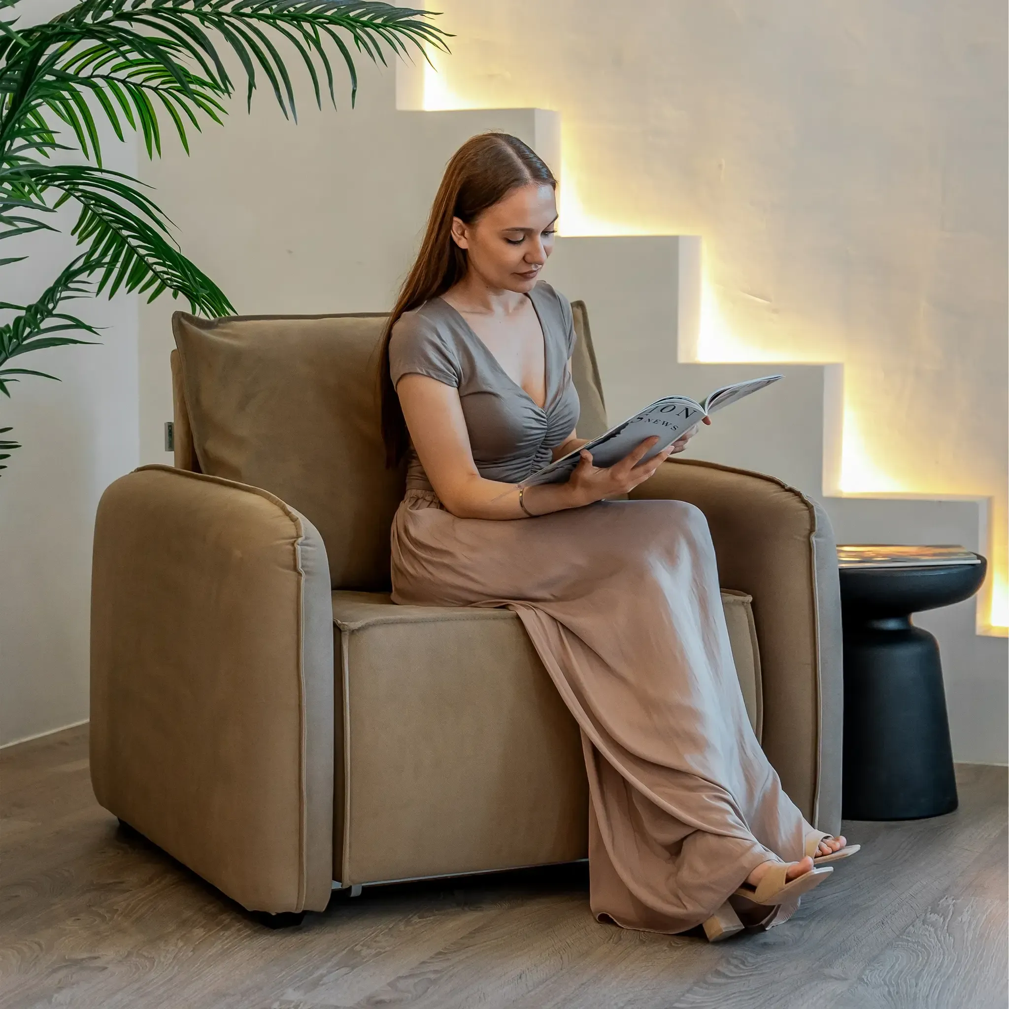 Кресло-кровать Портленд отличается своим лаконичным и стильным дизайном, который делает его отличным решением для комфортного отдыха. Благодаря своему универсальному внешнему виду, оно легко впишется в любой интерьер, добавляя ему элегантности и уюта. Это многофункциональное кресло может стать дополнительным гостевым спальным местом в вашем доме, обеспечивая удобство для ваших гостей. УМНАЯ ТКАНЬ ОТ CHISTETIKA Обивка кресла - мягкий бархатистый премиальный велюр. Тонкая динамика узора обивки создаёт в пространстве ощущение лёгкости и движения. Технология Waterproof делает ткань устойчивой к влаге, и благодаря этому обивка долговечна и проста в уходе. Не впитывает жидкости, а загрязнения с нее удаляются легко и быстро.Обивка имеет повышенный уровень износоустойчивости 65 000 циклов (по тесту Мартиндейла). Ткань рекомендована для владельцев домашних животных. ОСНОВАНИЕ Высокоплотный ППУ-матрас в гарантирует удобство и комфорт при отдыхе на кресле. Основой служит пружинный блок змейка, он отличается надежностью и долговечностью службы. КАРКАС В конструкции кресла используются материалы из натурального дерева, которые гарантируют экологичность и прочность каркаса. Под сиденьем предусмотрен бельевой ящик, в который можно убрать постельное белье.   ХАРАКТЕРИСТИКИ: Габариты (см): 97х90х89 Спальное место (см): 70х200 Высота посадочного места (см): 40 Механизм: Аккордеон-евро Материал обивки: Велюр Короб для белья: Есть Наполнитель: Пружины змейка / ППУ Каркас: ДСП/Фанера   Фабрика D1 является российским производителем мебели. Мы осуществляем полный производственный цикл всего представленного ассортимента. Все используемые материалы и комплектующие сертифицированы и соответствуют САНПиН. На всю нашу продукцию мы даём гарантию 18 месяцев.