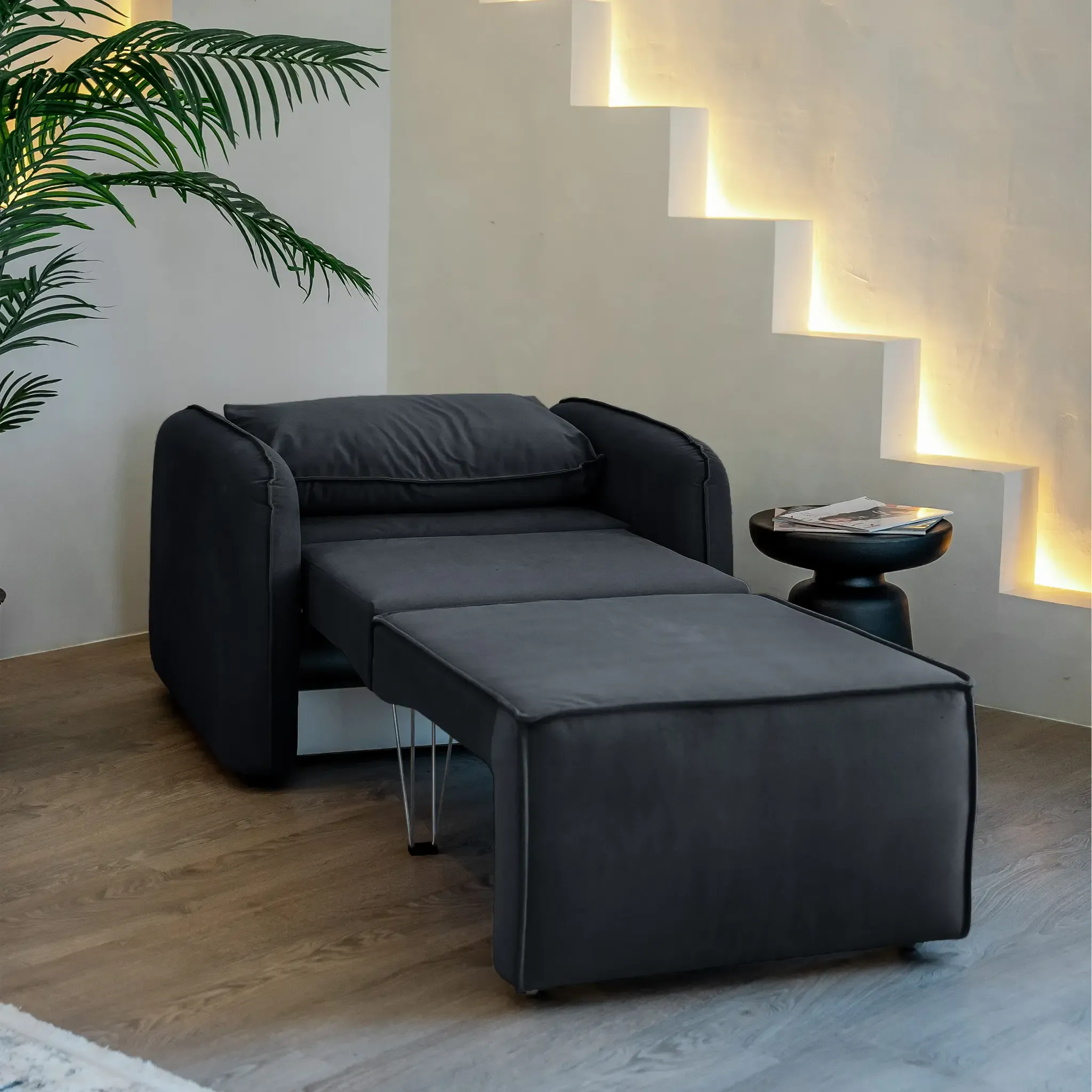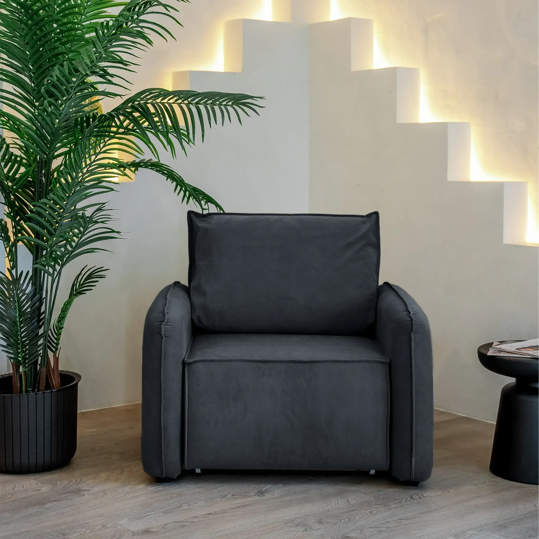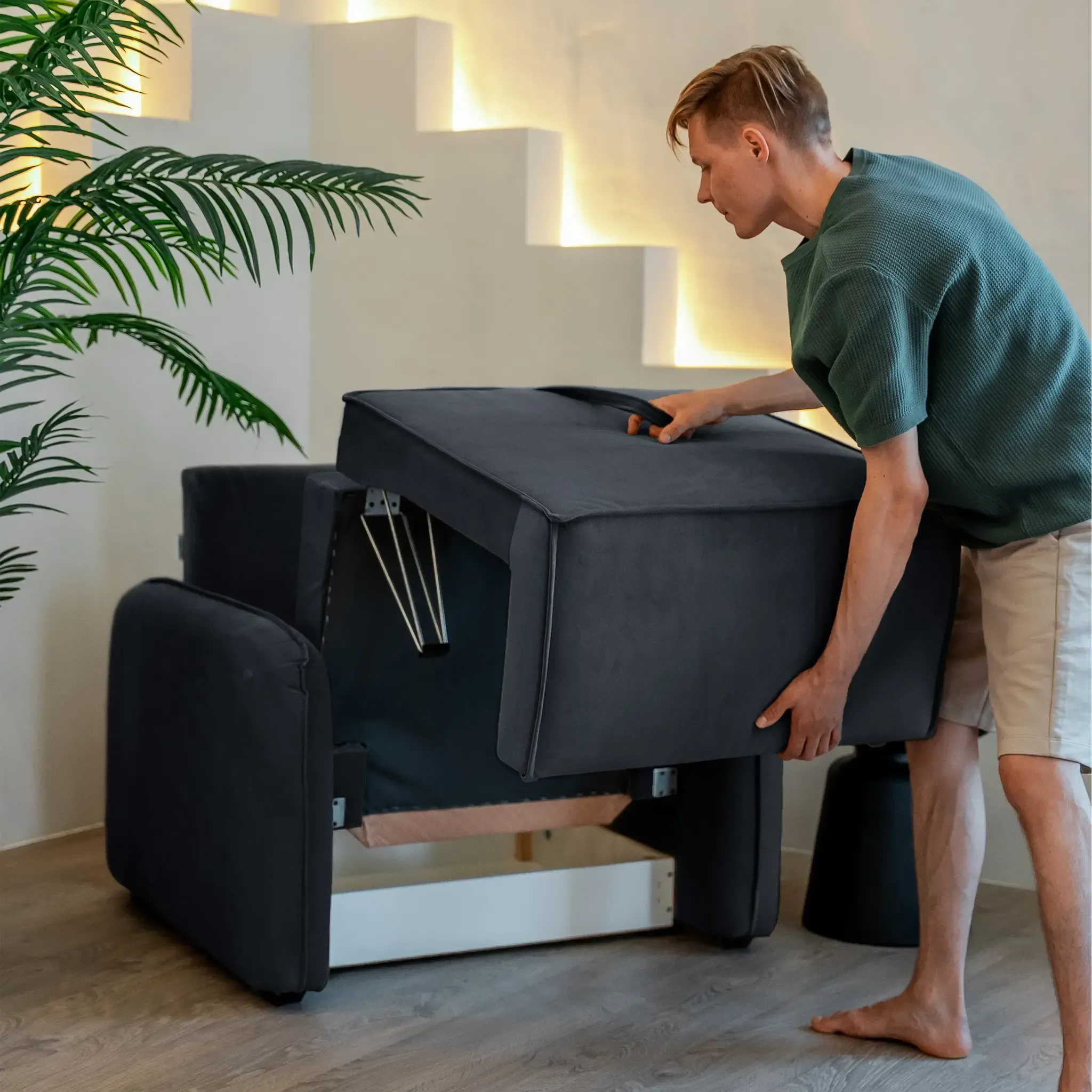 Кресло-кровать Портленд отличается своим лаконичным и стильным дизайном, который делает его отличным решением для комфортного отдыха. Благодаря своему универсальному внешнему виду, оно легко впишется в любой интерьер, добавляя ему элегантности и уюта. Это многофункциональное кресло может стать дополнительным гостевым спальным местом в вашем доме, обеспечивая удобство для ваших гостей. УМНАЯ ТКАНЬ ОТ CHISTETIKA Обивка кресла - мягкий бархатистый премиальный велюр. Тонкая динамика узора обивки создаёт в пространстве ощущение лёгкости и движения. Технология Waterproof делает ткань устойчивой к влаге, и благодаря этому обивка долговечна и проста в уходе. Не впитывает жидкости, а загрязнения с нее удаляются легко и быстро.Обивка имеет повышенный уровень износоустойчивости 65 000 циклов (по тесту Мартиндейла). Ткань рекомендована для владельцев домашних животных. ОСНОВАНИЕ Высокоплотный ППУ-матрас в гарантирует удобство и комфорт при отдыхе на кресле. Основой служит пружинный блок змейка, он отличается надежностью и долговечностью службы. КАРКАС В конструкции кресла используются материалы из натурального дерева, которые гарантируют экологичность и прочность каркаса. Под сиденьем предусмотрен бельевой ящик, в который можно убрать постельное белье.   ХАРАКТЕРИСТИКИ: Габариты (см): 97х90х89 Спальное место (см): 70х200 Высота посадочного места (см): 40 Механизм: Аккордеон-евро Материал обивки: Велюр Короб для белья: Есть Наполнитель: Пружины змейка / ППУ Каркас: ДСП/Фанера   Фабрика D1 является российским производителем мебели. Мы осуществляем полный производственный цикл всего представленного ассортимента. Все используемые материалы и комплектующие сертифицированы и соответствуют САНПиН. На всю нашу продукцию мы даём гарантию 18 месяцев.