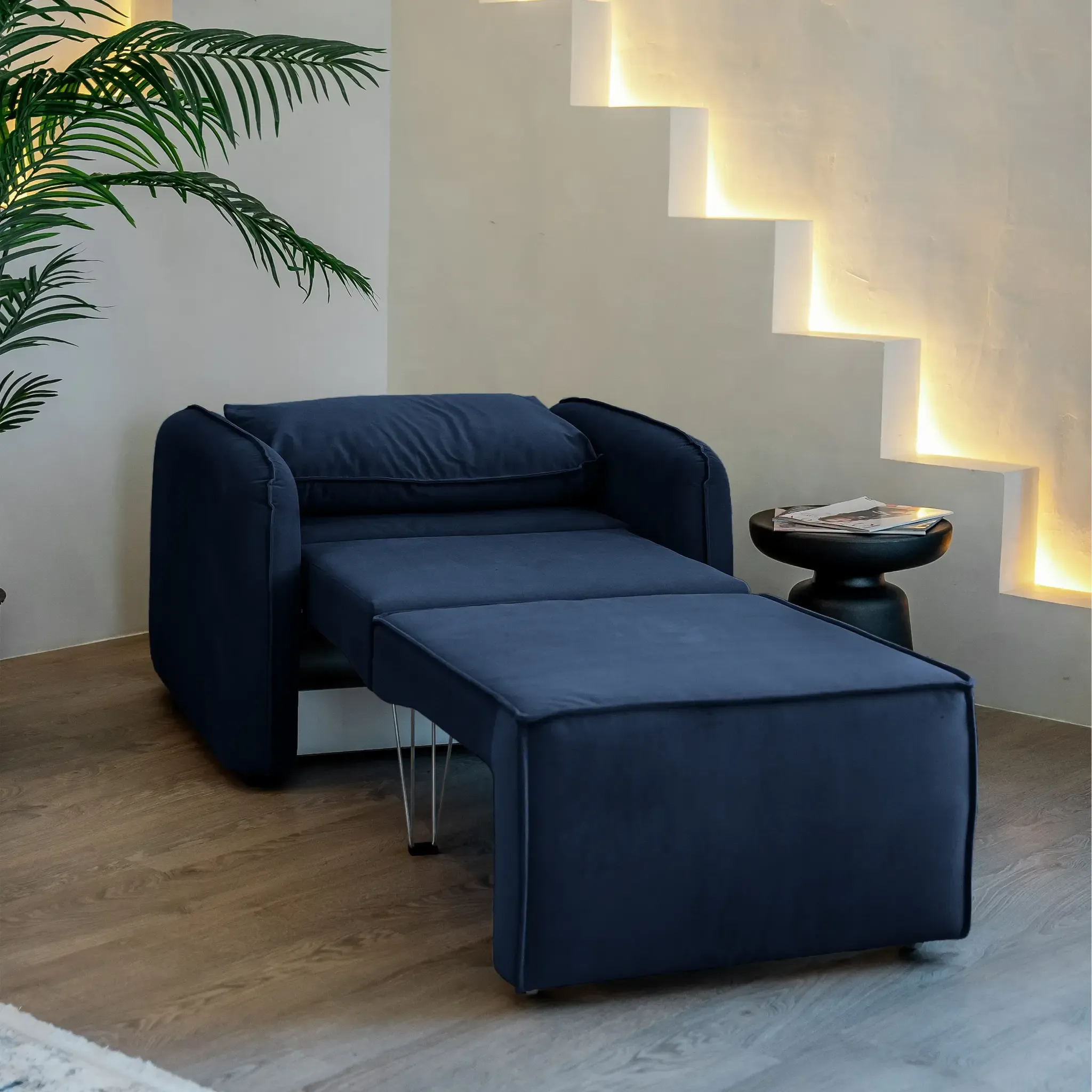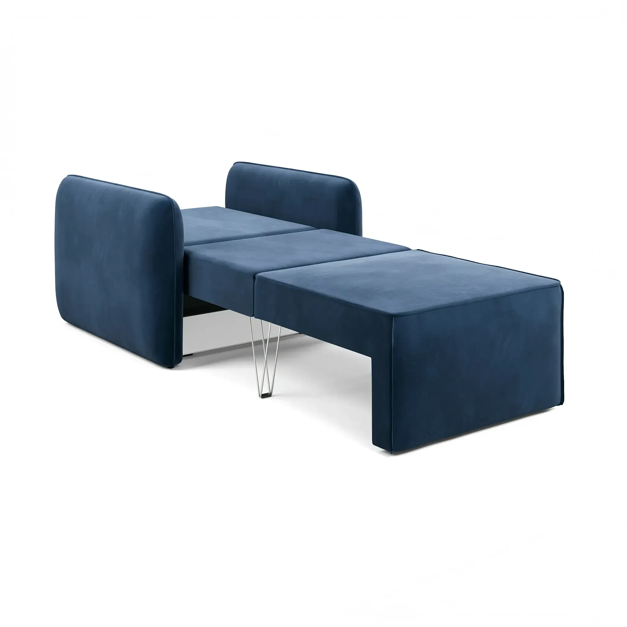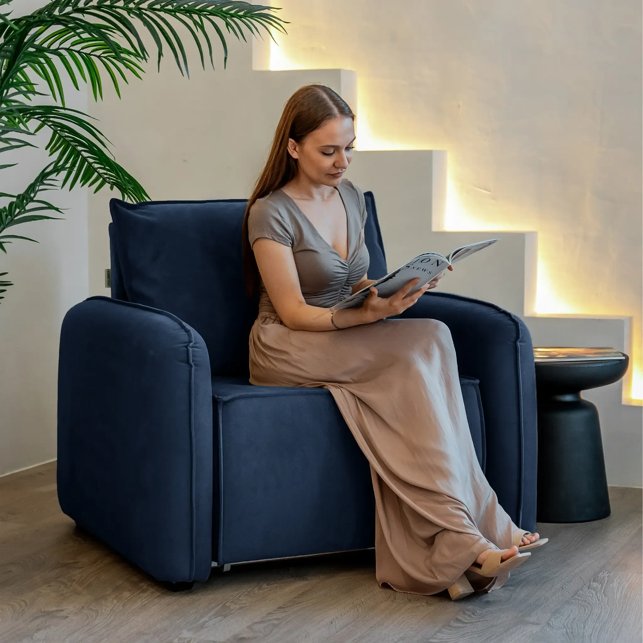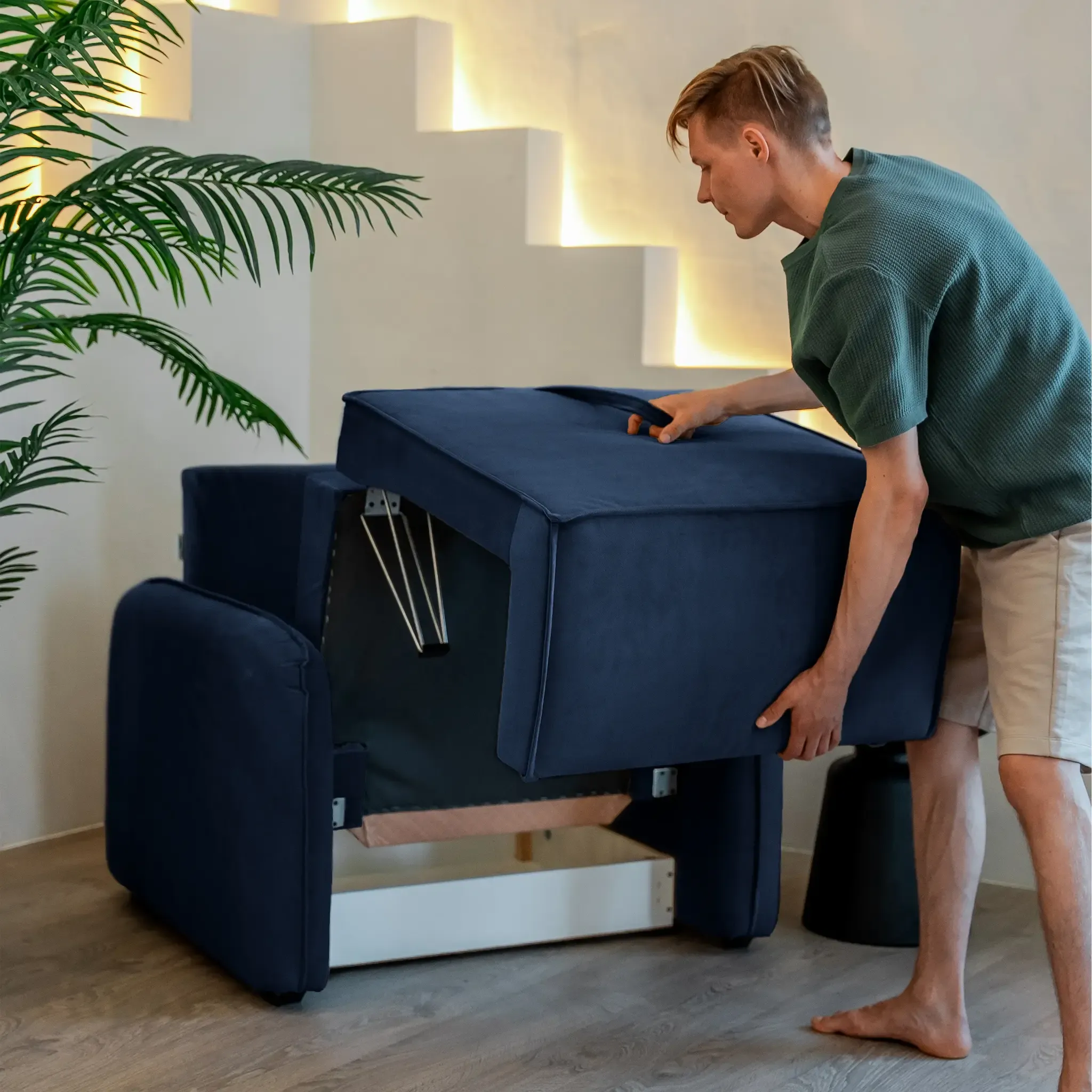 Кресло-кровать Портленд отличается своим лаконичным и стильным дизайном, который делает его отличным решением для комфортного отдыха. Благодаря своему универсальному внешнему виду, оно легко впишется в любой интерьер, добавляя ему элегантности и уюта. Это многофункциональное кресло может стать дополнительным гостевым спальным местом в вашем доме, обеспечивая удобство для ваших гостей. УМНАЯ ТКАНЬ ОТ CHISTETIKA Обивка кресла - мягкий бархатистый премиальный велюр. Тонкая динамика узора обивки создаёт в пространстве ощущение лёгкости и движения. Технология Waterproof делает ткань устойчивой к влаге, и благодаря этому обивка долговечна и проста в уходе. Не впитывает жидкости, а загрязнения с нее удаляются легко и быстро.Обивка имеет повышенный уровень износоустойчивости 65 000 циклов (по тесту Мартиндейла). Ткань рекомендована для владельцев домашних животных. ОСНОВАНИЕ Высокоплотный ППУ-матрас в гарантирует удобство и комфорт при отдыхе на кресле. Основой служит пружинный блок змейка, он отличается надежностью и долговечностью службы. КАРКАС В конструкции кресла используются материалы из натурального дерева, которые гарантируют экологичность и прочность каркаса. Под сиденьем предусмотрен бельевой ящик, в который можно убрать постельное белье.   ХАРАКТЕРИСТИКИ: Габариты (см): 97х90х89 Спальное место (см): 70х200 Высота посадочного места (см): 40 Механизм: Аккордеон-евро Материал обивки: Велюр Короб для белья: Есть Наполнитель: Пружины змейка / ППУ Каркас: ДСП/Фанера   Фабрика D1 является российским производителем мебели. Мы осуществляем полный производственный цикл всего представленного ассортимента. Все используемые материалы и комплектующие сертифицированы и соответствуют САНПиН. На всю нашу продукцию мы даём гарантию 18 месяцев.