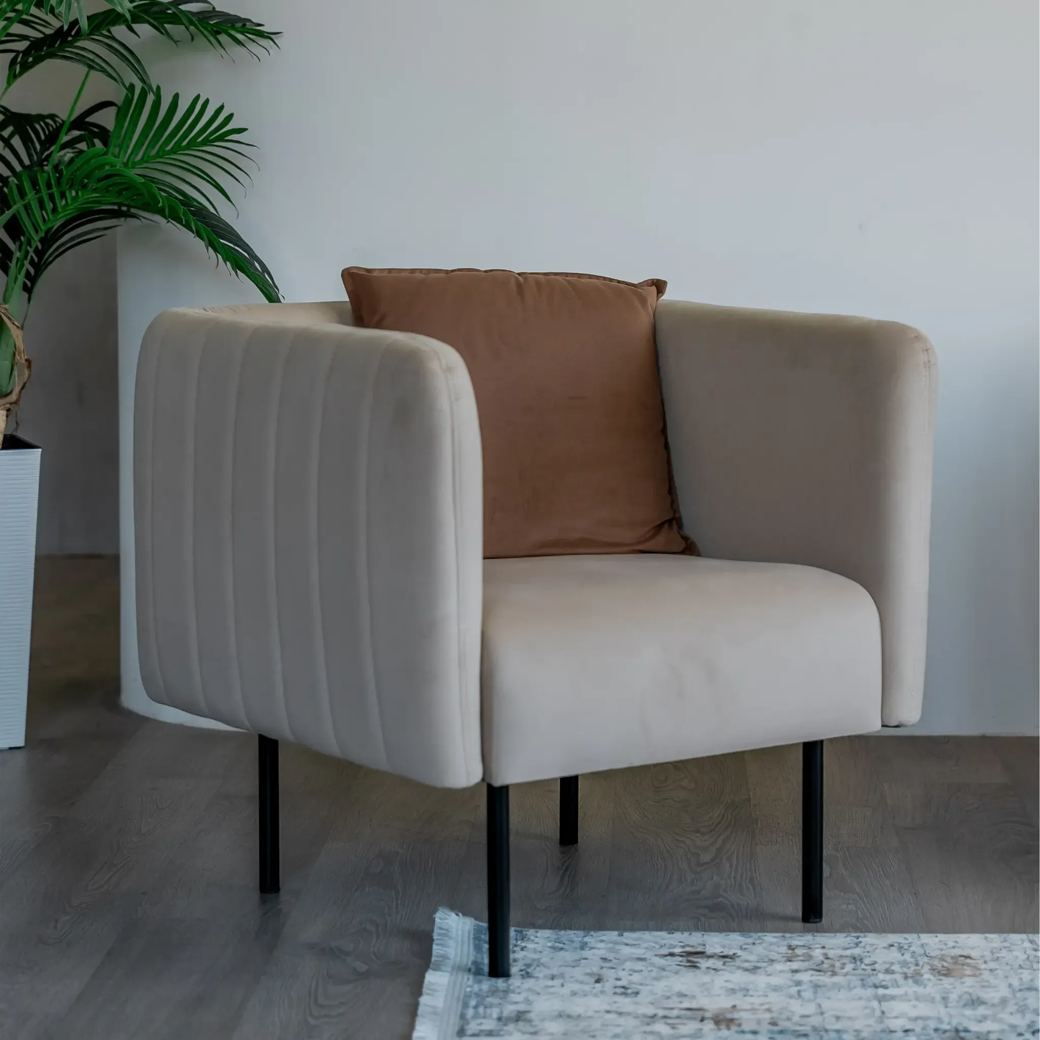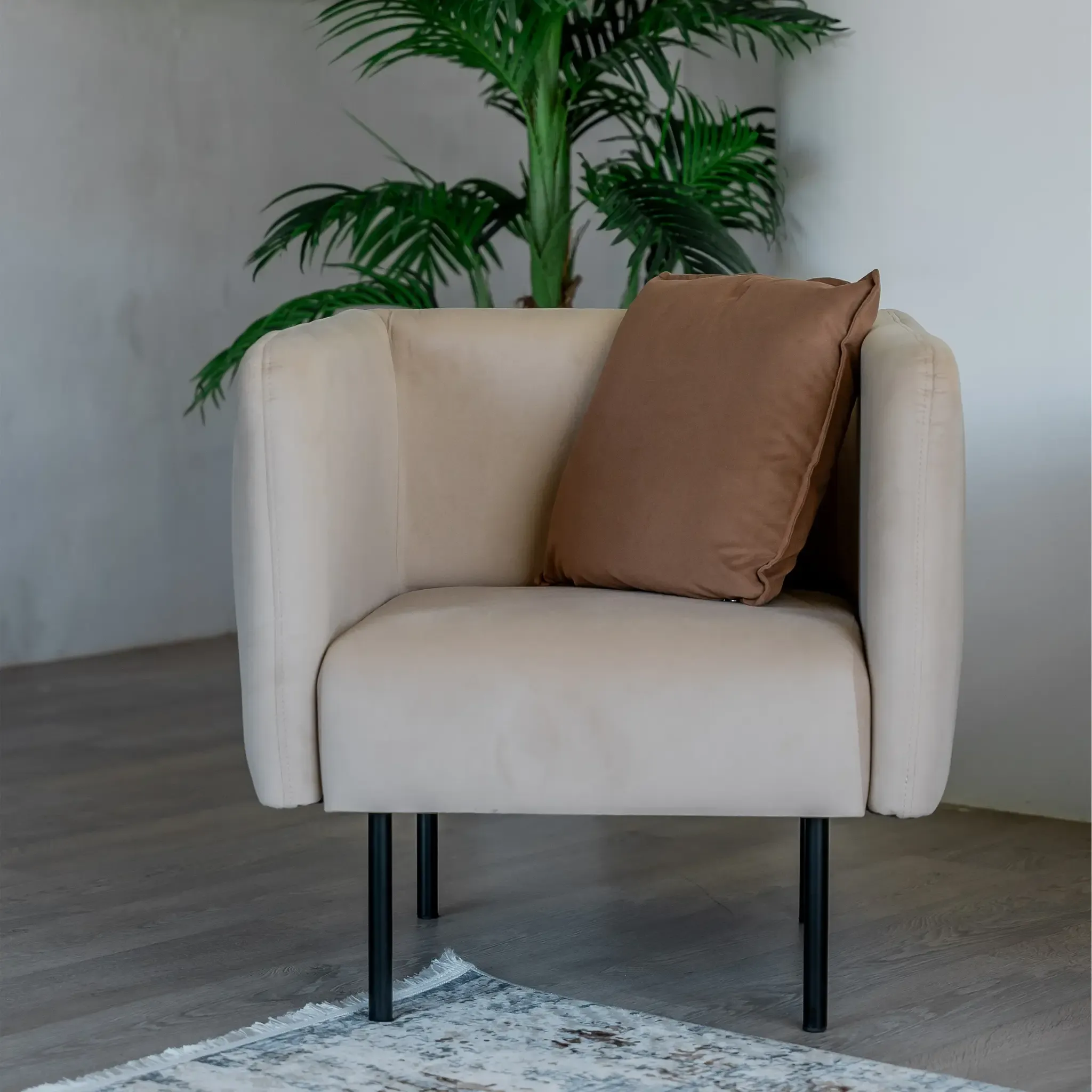 Ультрасовременное кресло РИО станет украшением дома, дачи, ресторана или офиса. Актуальный дизайн сочетается с удобством модели. Комфортное сиденье располагается на минималистичных ножках. Кресло смотрится легко и воздушно! Доступны яркие и нейтральные цвета обивки. ОБИВКА Обивка кресла - мягкий бархатистый велюр. Это тактильно приятная и очень практичная ткань.· Обивка имеет повышенный уровень износоустойчивости 60 000 циклов (по тесту Мартиндейла).· Ткань рекомендована для владельцев домашних животных.· Для велюра пригодна профессиональная химчистка, сухая чистка и чистка влажной губкой. ОСНОВАНИЕ Высокоплотный ППУ-матрас располагается на основании из пружинных змеек. Это гарантирует удобство и комфорт при отдыхе на кресле. КАРКАС В конструкции кресла используются сертифицированные материалы из натурального дерева и экологичная фанера. Каркас надежный, прочный, долговечный и безопасный! Характеристики:  Габариты (см): 70х70х75 Высота посадочного места (см): 45 Каркас: Фанера / ДСП Высота ножек (см): 22 Вес (кг): 17  Фабрика D1 является российским производителем мебели. Мы осуществляем полный производственный цикл всего представленного ассортимента. Все используемые материалы и комплектующие сертифицированы и соответствуют САНПиН. На всю нашу продукцию мы даём гарантию 18 месяцев.