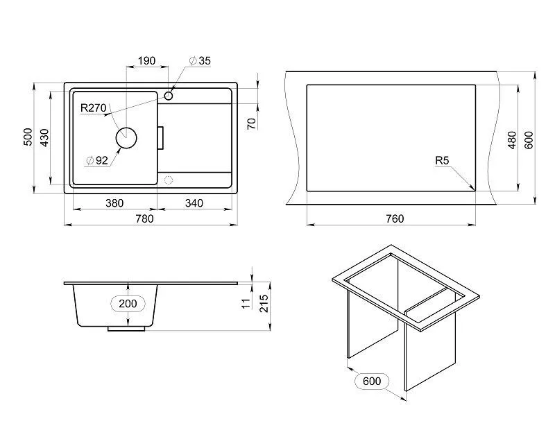 7804, ГРАФИТ (ЧЁРНО-СЕРЫЙ), кухонная мойка, кварц