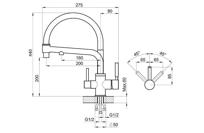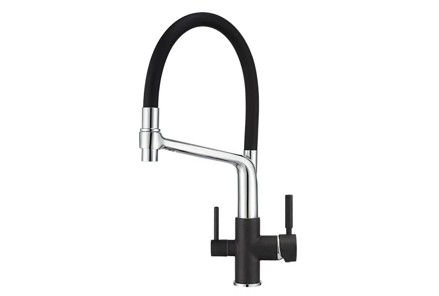Смеситель для кухонной мойки Granula 0083 изготовлен из высококачественного материала. Латунный корпус обеспечивает длительный срок службы. При этом высокий излив с гибким шлангом позволяет мыть как мелкую, так и крупногабаритную посуду. Двухрычажная модель смесителя Granula 0083 выполнена с краном для питьевой воды. Фильтрованная вода подается по отдельной трубке и не смешивается с водопроводной водой.
