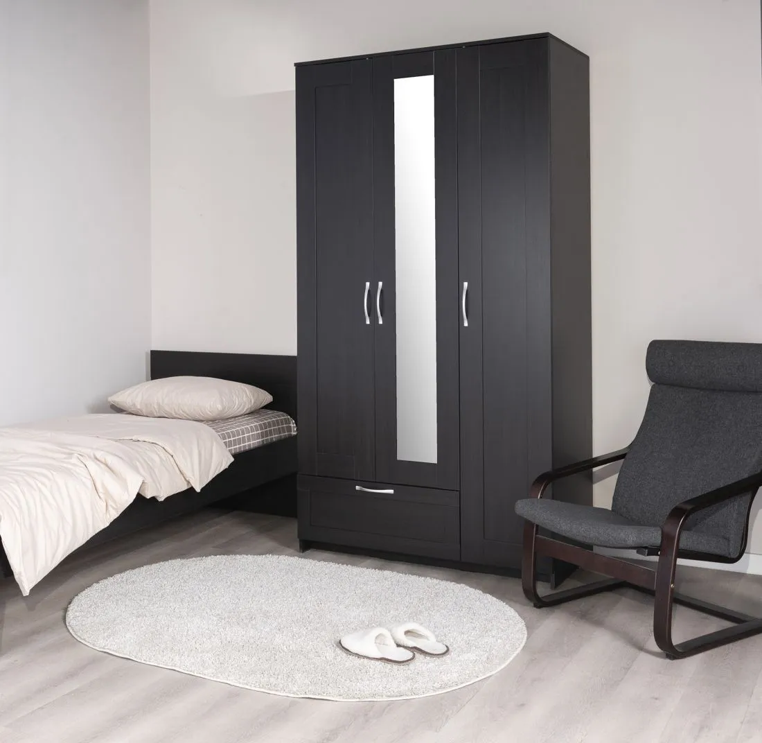 Шкаф СИРИУС комбинированный для одежды трехдверный, с выдвижным ящиком и одним зеркалом, 1171х585х2196, цвет Дуб Венге. Изготовлен из кашированного ДСП толщиной 16 мм. Крепится к стене. Гарантийный срок для жилых помещений 24 месяца, для общественных помещений - 18 месяцев.