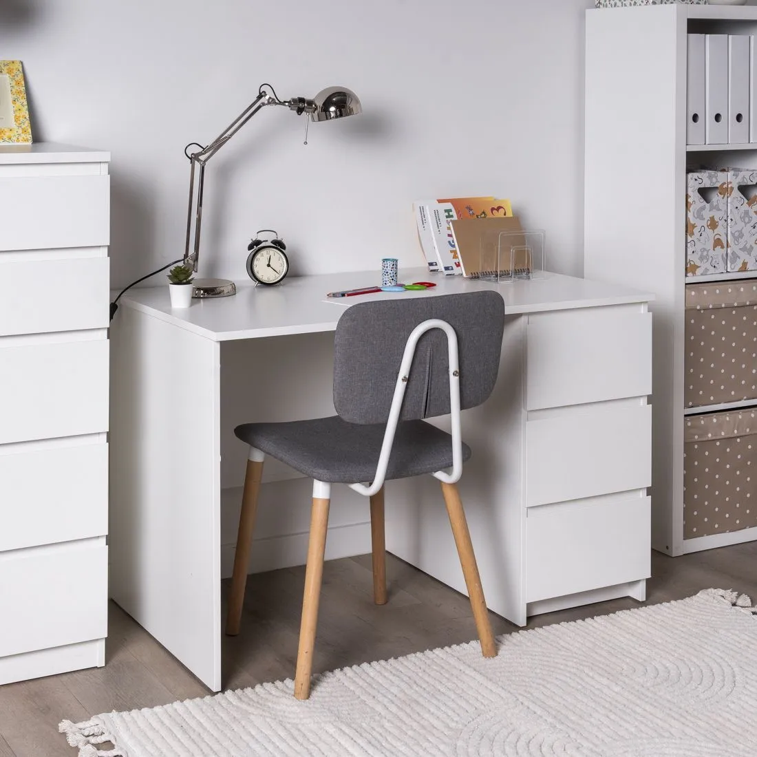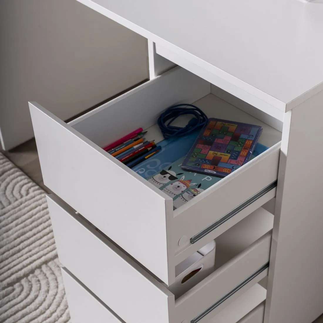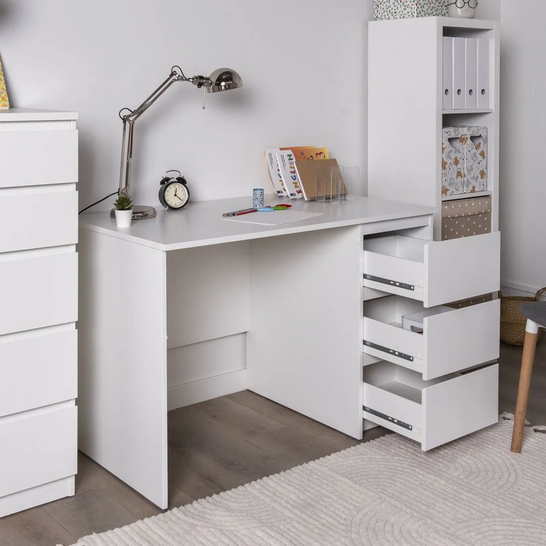 Стол письменный КАСТОР с тремя наружными выдвижными ящиками, 1510х650х750, цвет Белый. Изготовлен из кашированного ДСП толщиной  16 мм. Тумбу с ящиком можно разместить справа или слева под столешницей. Гарантийный срок для жилых помещений 24 месяца, для общественных помещений - 18 месяцев.