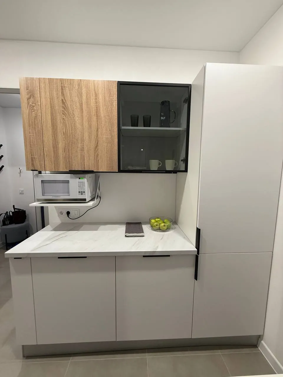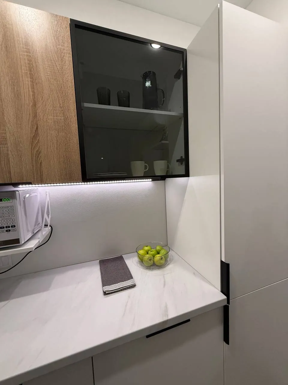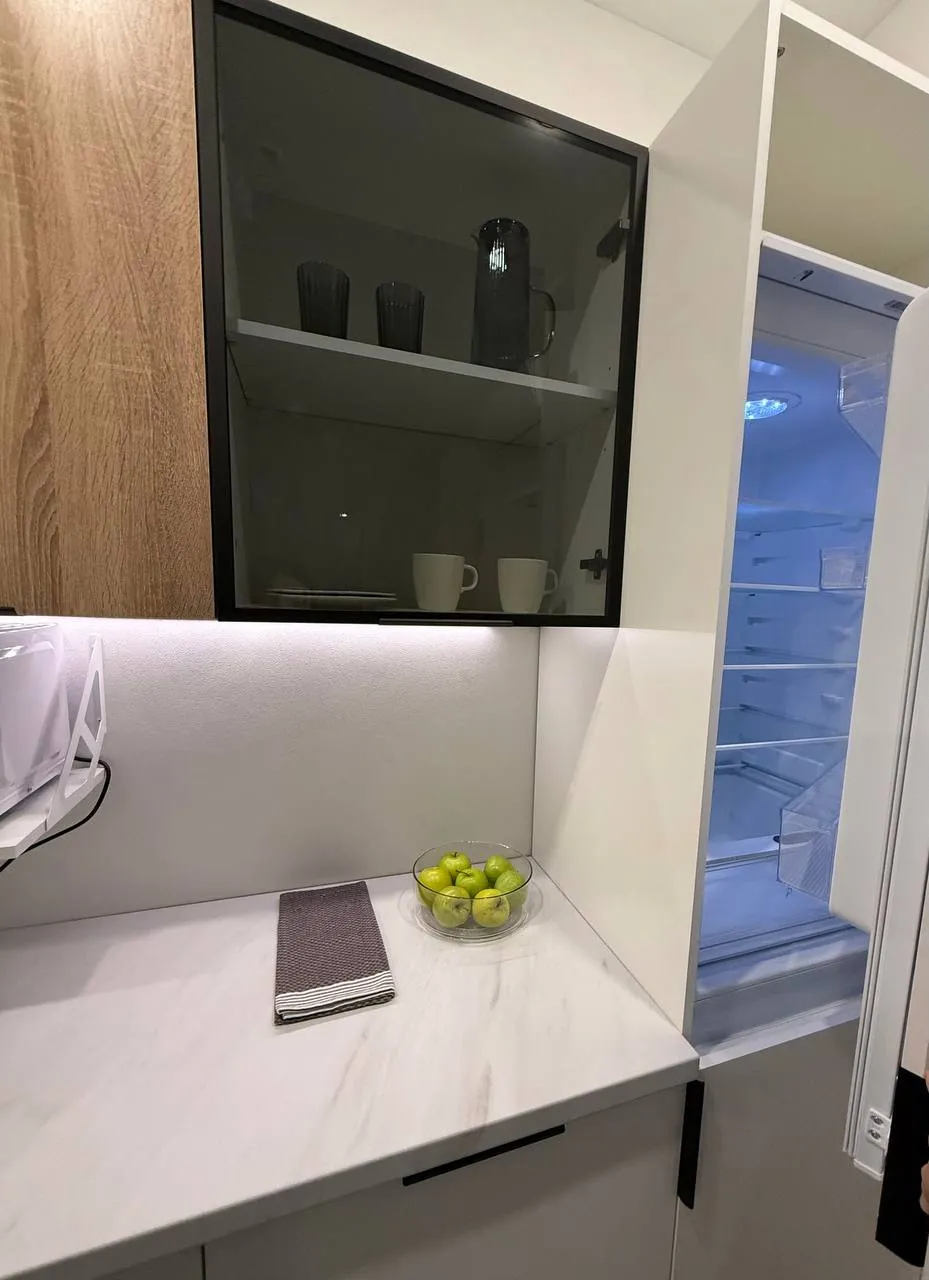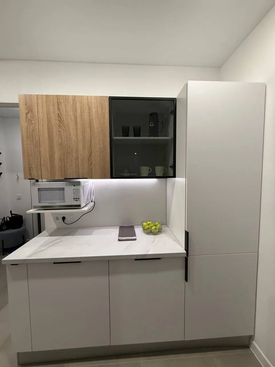 • Встроенная бытовая техника: мы подобрали и установили все необходимое — холодильник, варочную панель, вытяжку, микроволновую печь, а также телевизор и чайник.