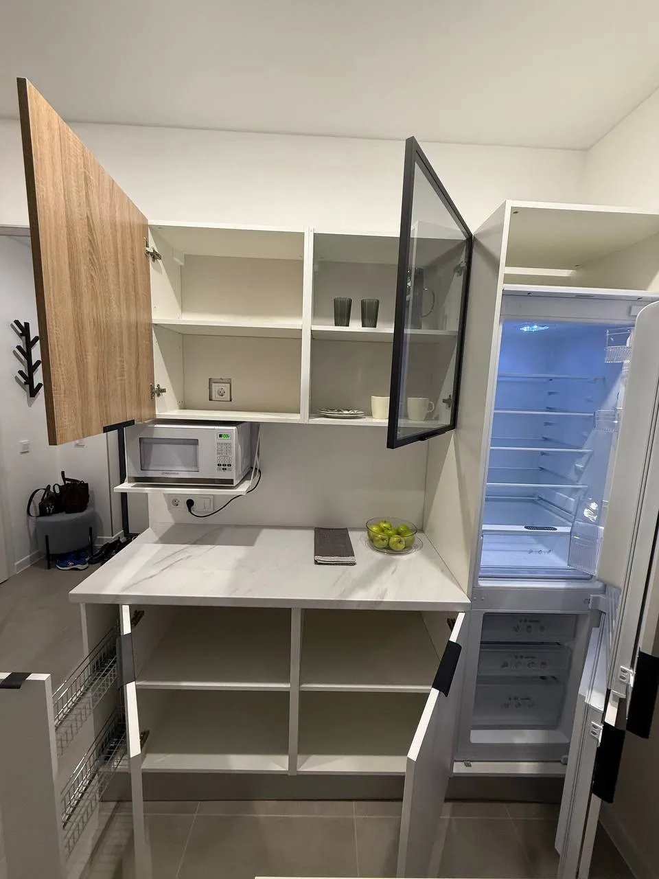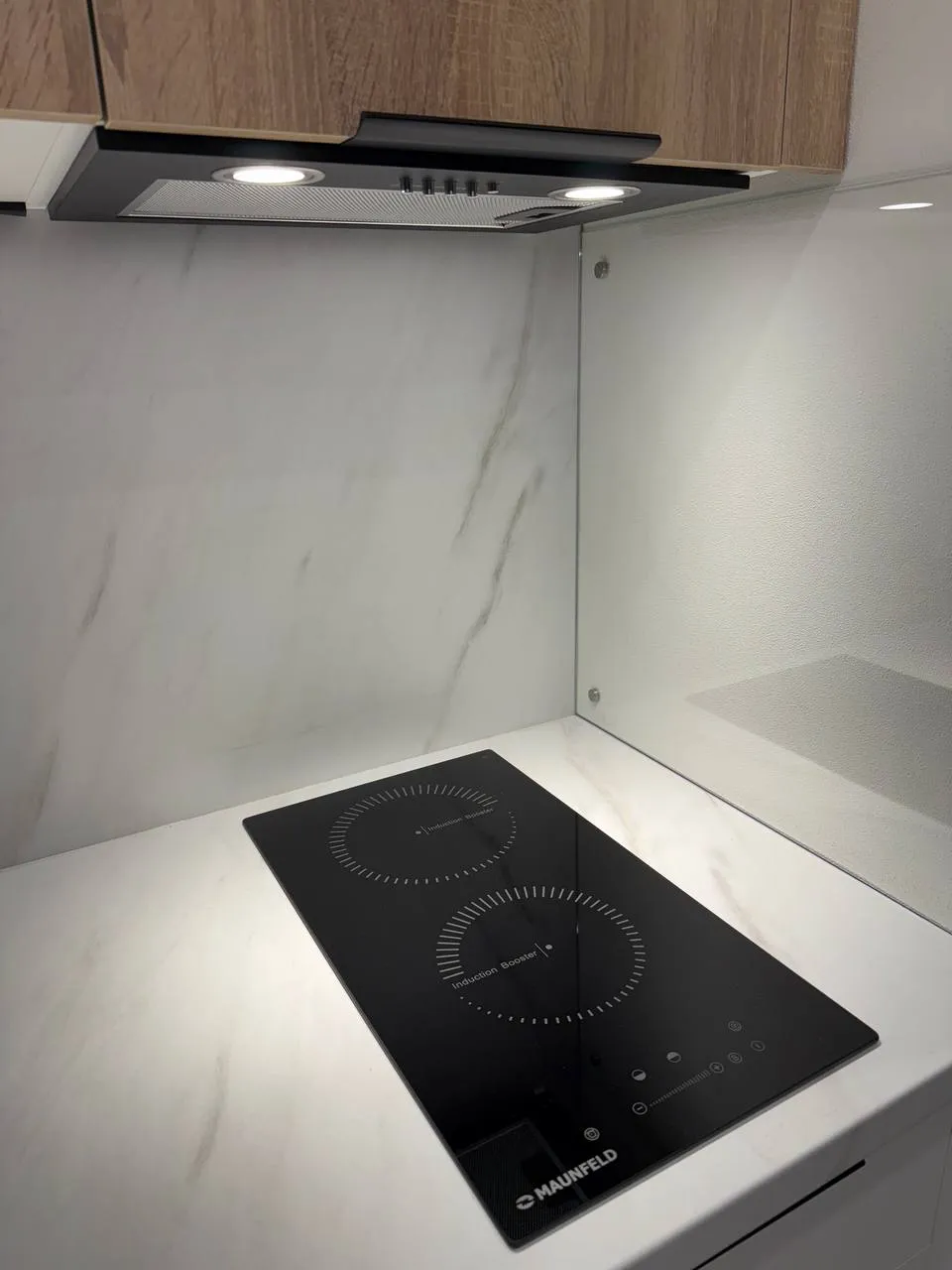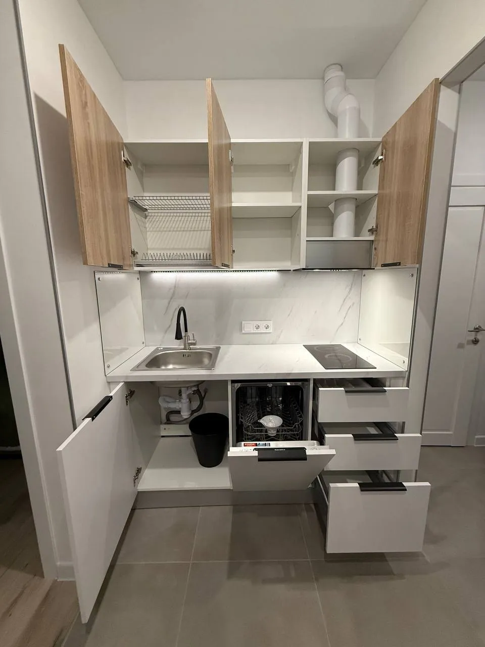 • Встроенная бытовая техника: мы подобрали и установили все необходимое — холодильник, варочную панель, вытяжку, микроволновую печь, а также телевизор и чайник.